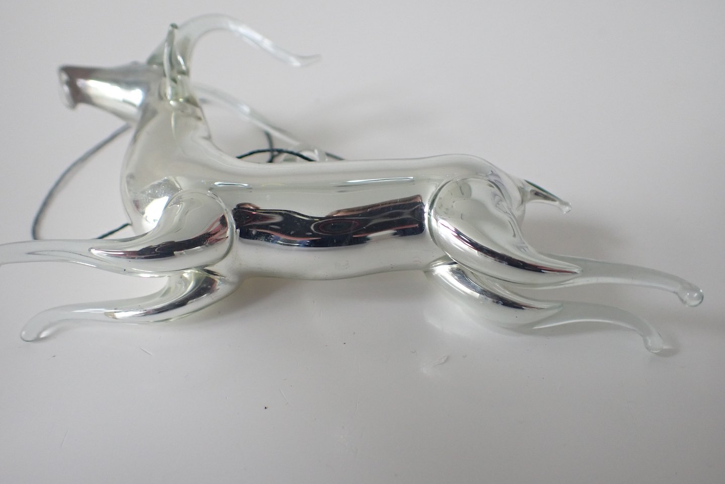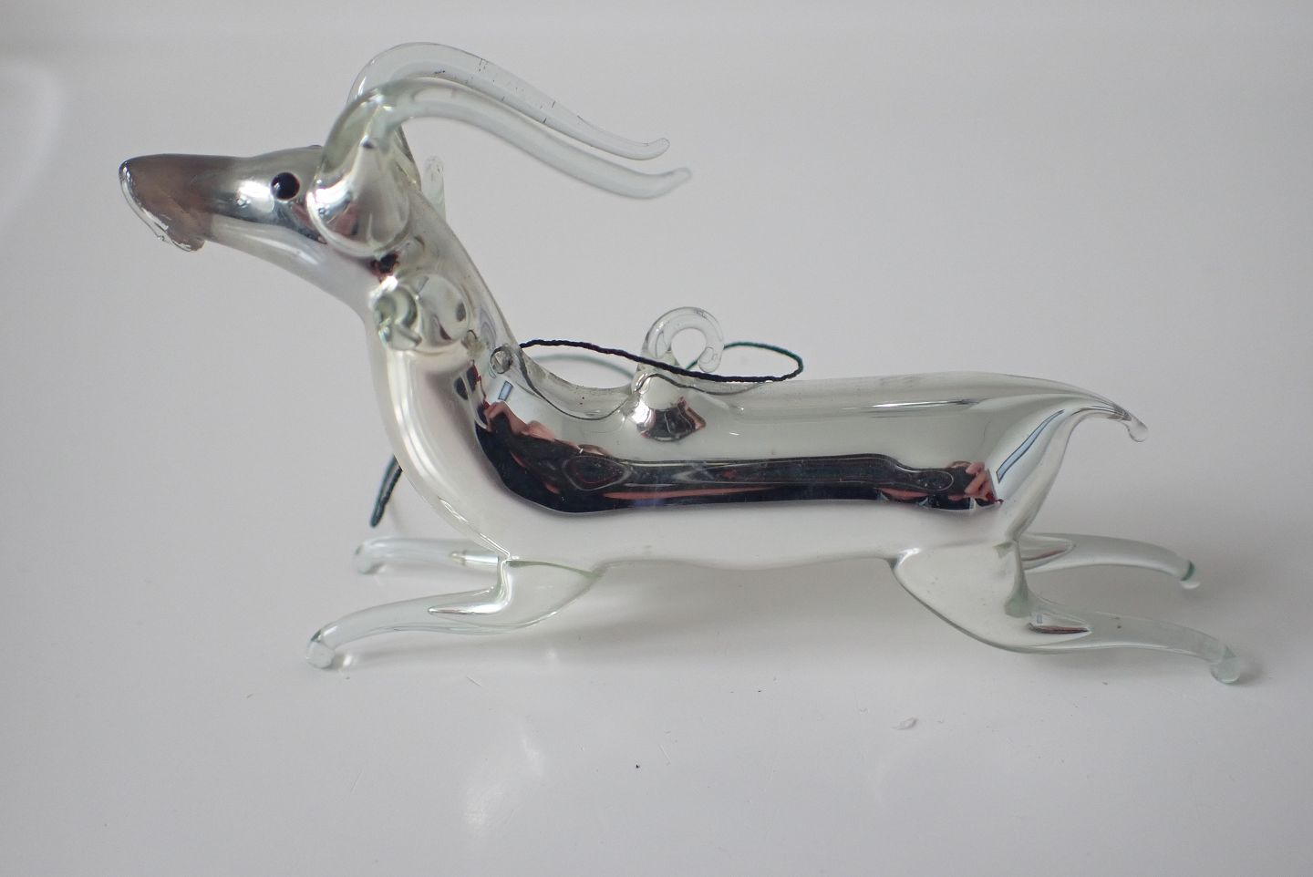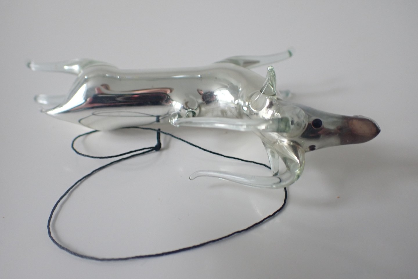 Text available in Danish: Glasjulepynt - sjælden glashjort, sølvfarvet. Med glasophæng. Leipzig tidlig 1900-tal. Højde. 5,2 cm. Længde: 9 cm. Hel og fin stand uden afslag.