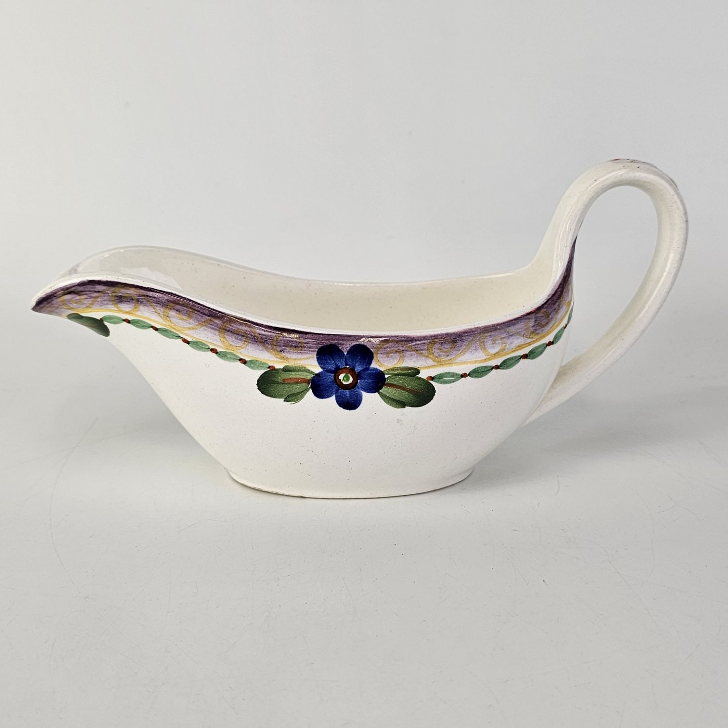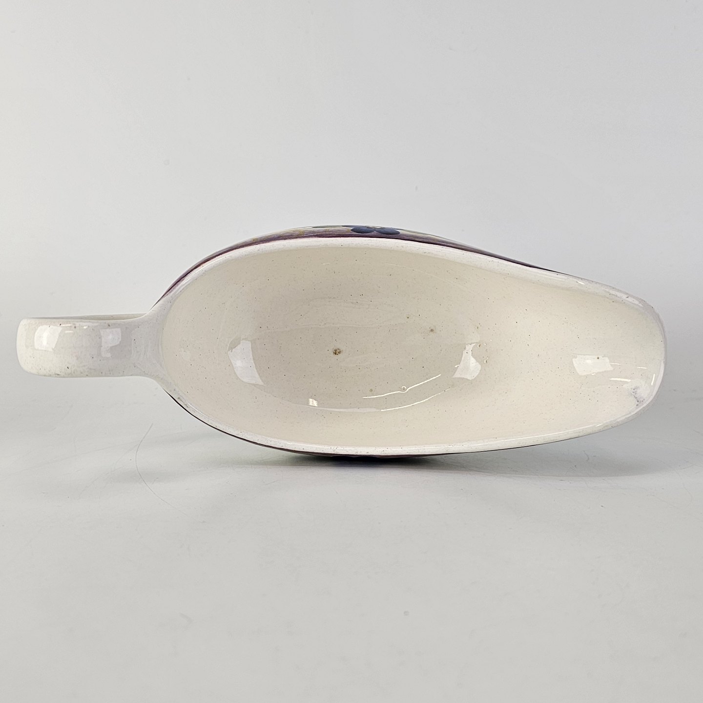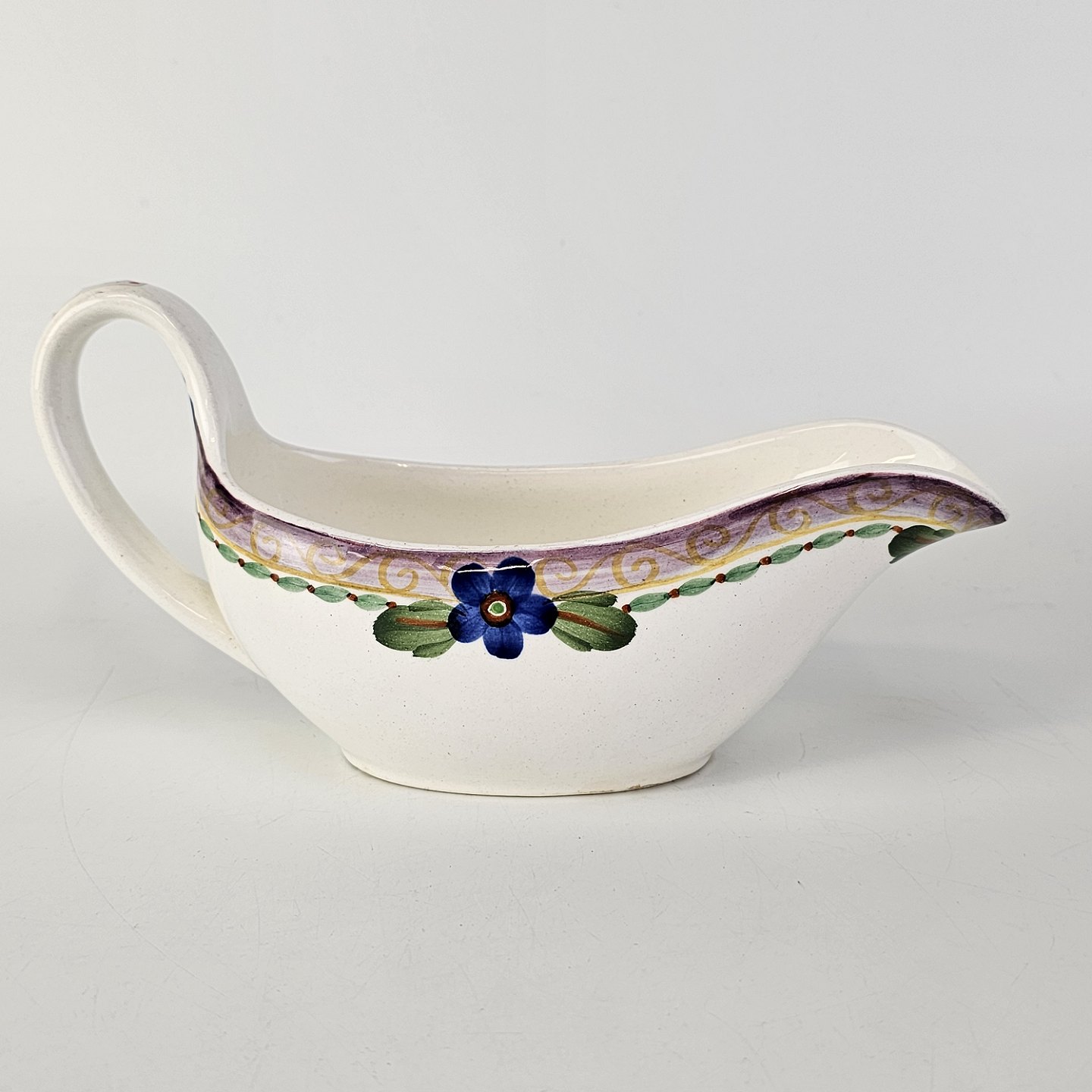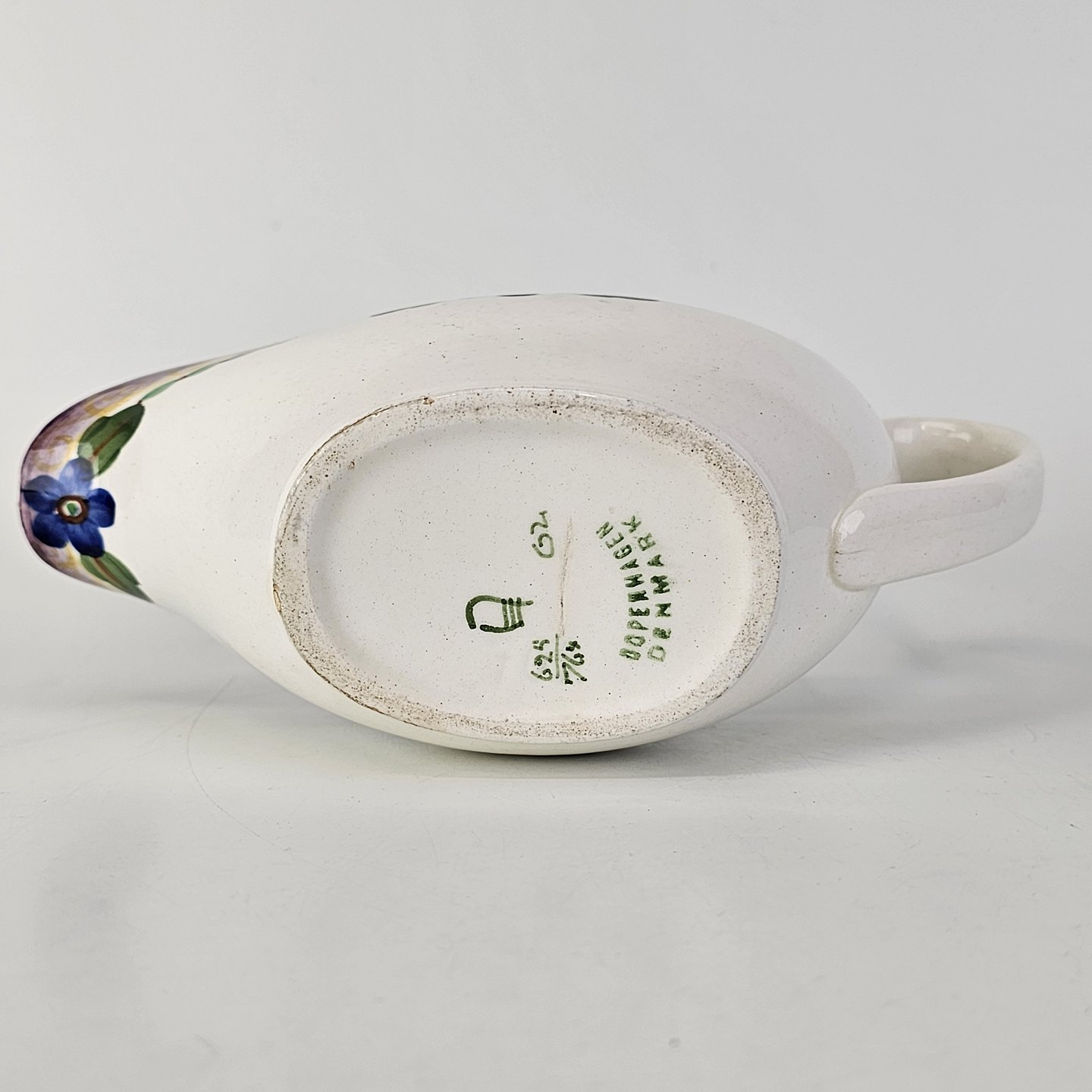 Stellet er i hvid fajance og håndmalet med dekoration af blå violer