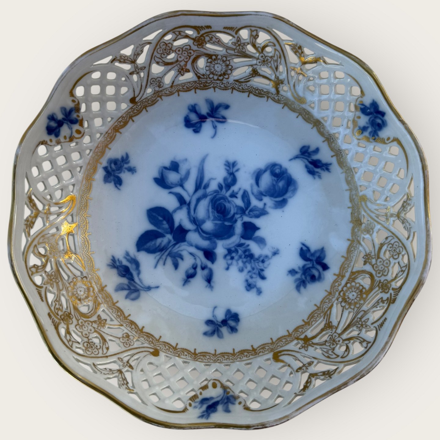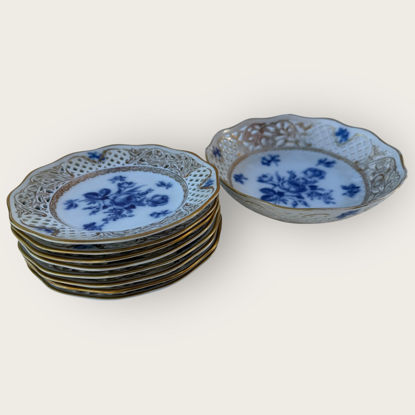 Schumann, Germany, Bowl and 8 plates with openwork rim, some wear on the bowl's gold rim, otherwise good condition, Plate diameter 19cm, Bowl diameter 23cm.