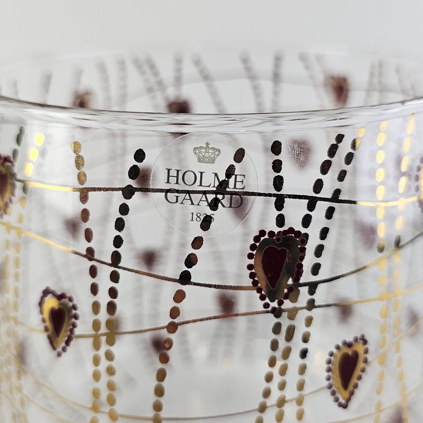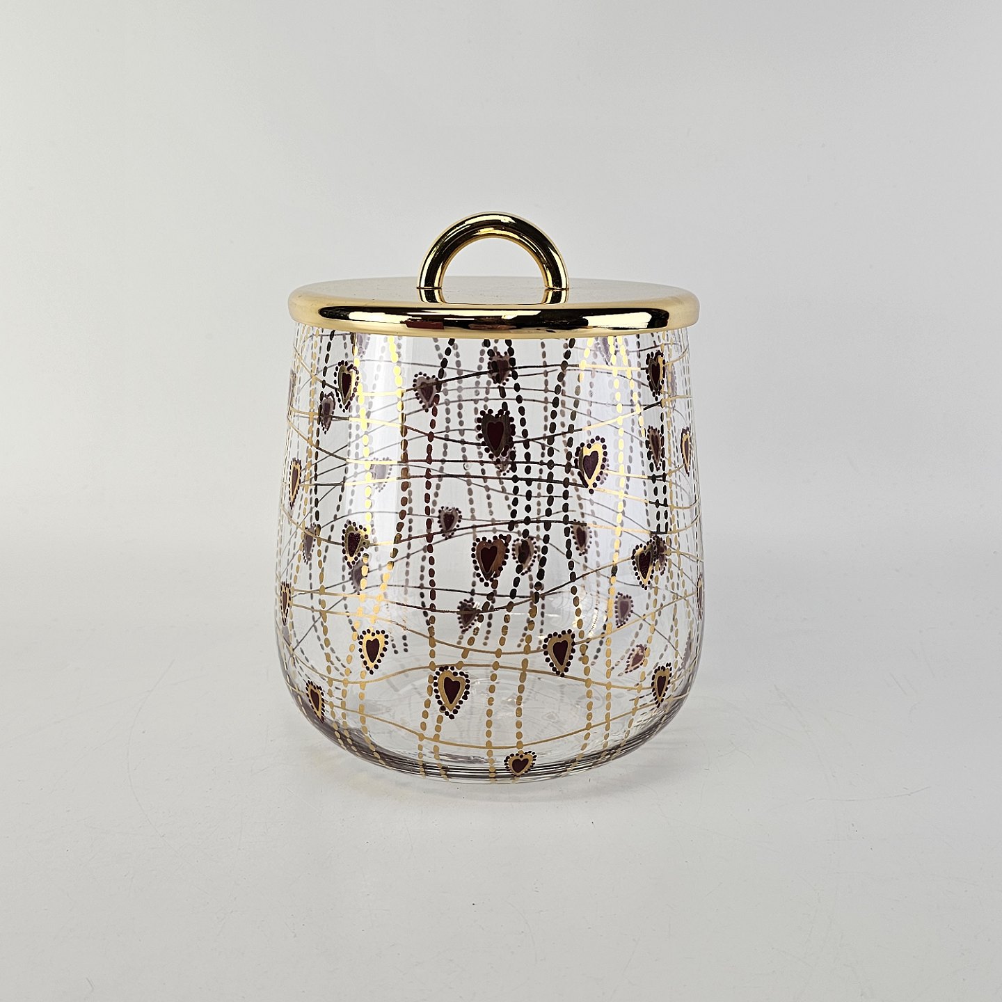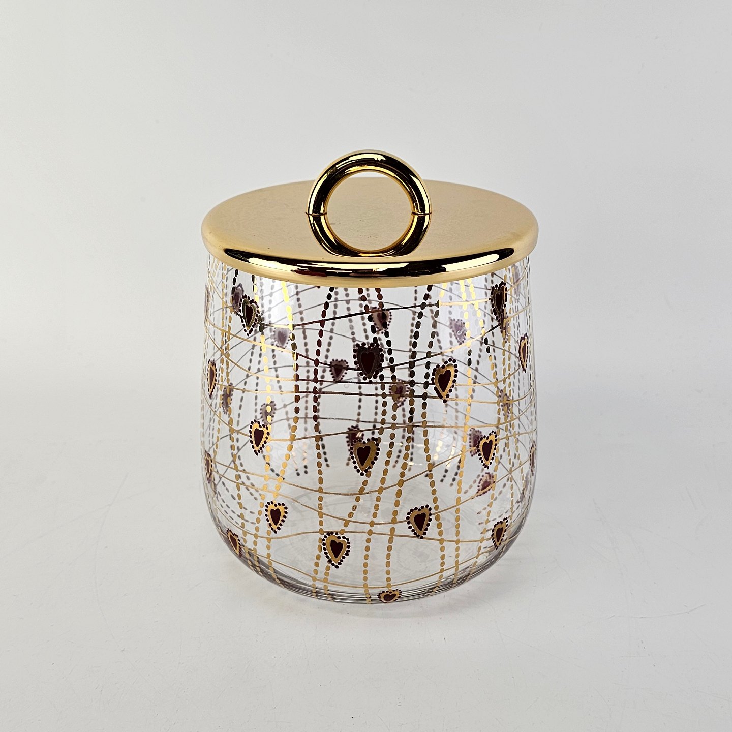 Kagedåse af glas med mønster af røde hjerter og guldstreger, og gyldent låg