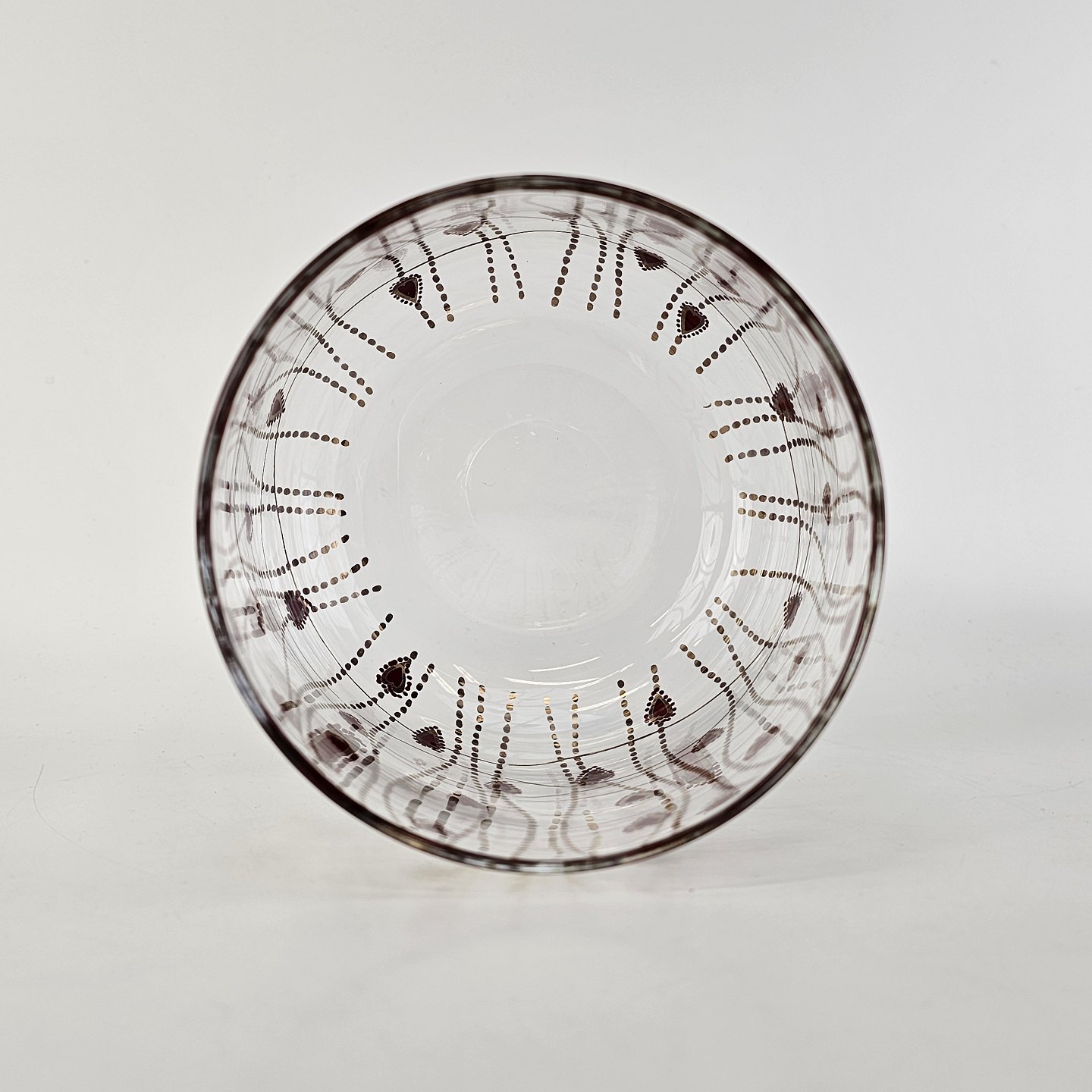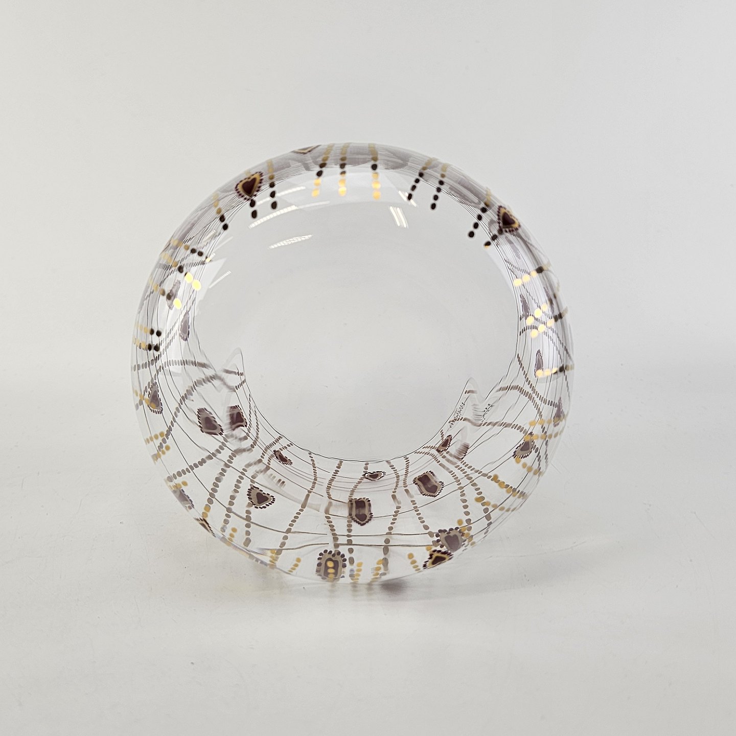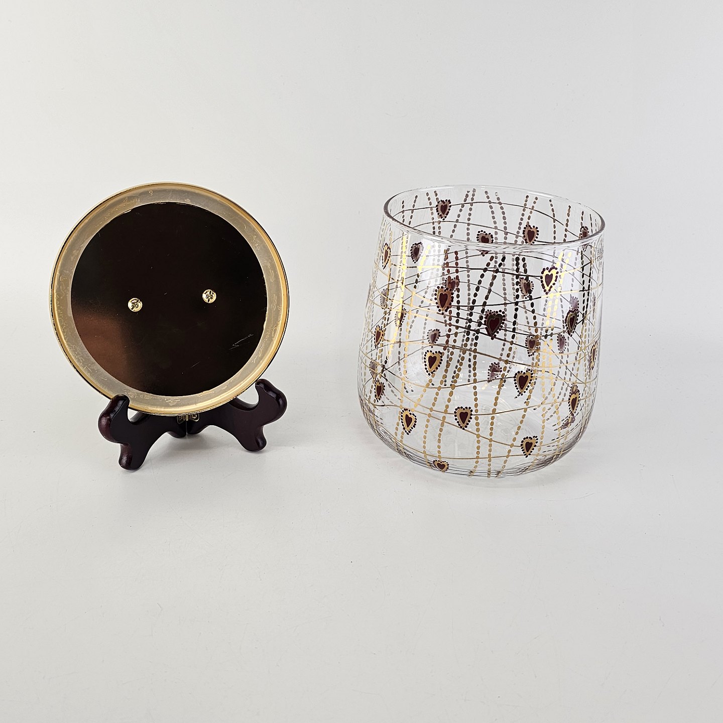 Kagedåse af glas med mønster af røde hjerter og guldstreger, og gyldent låg