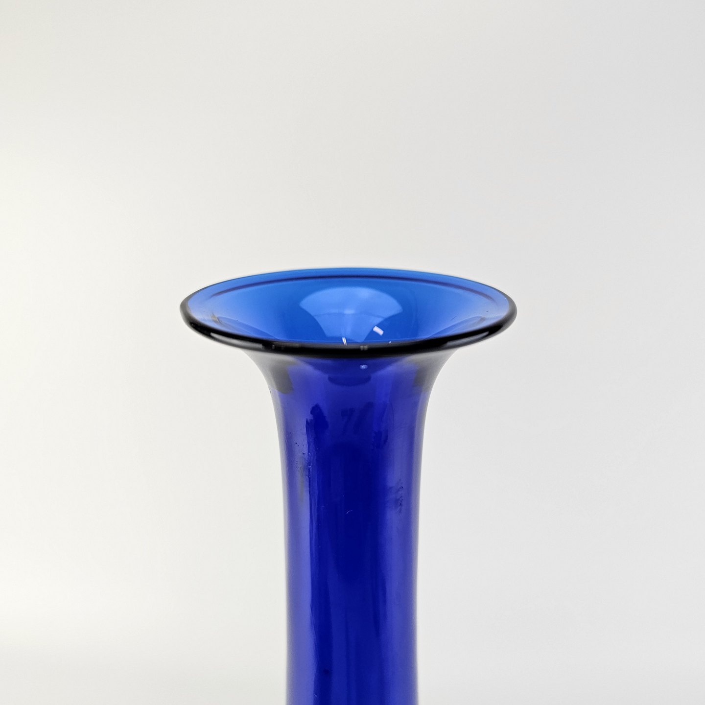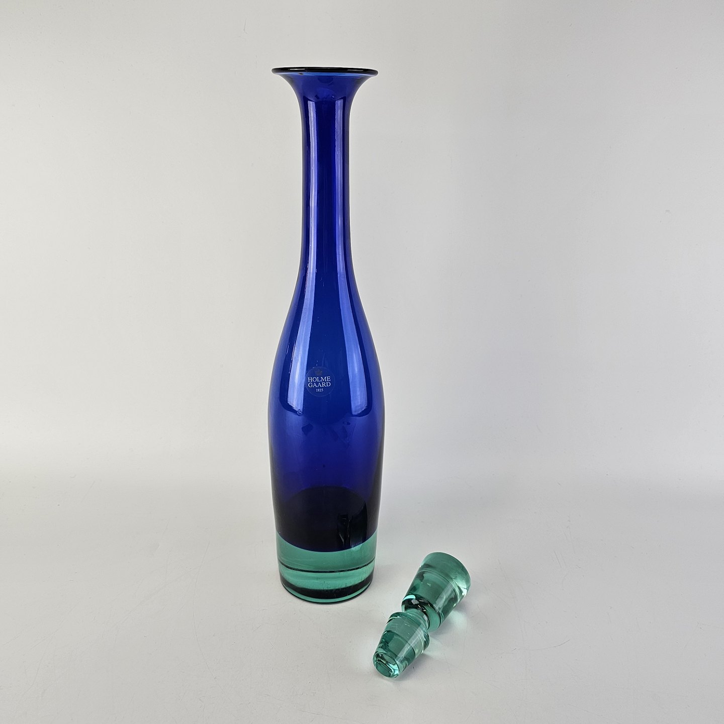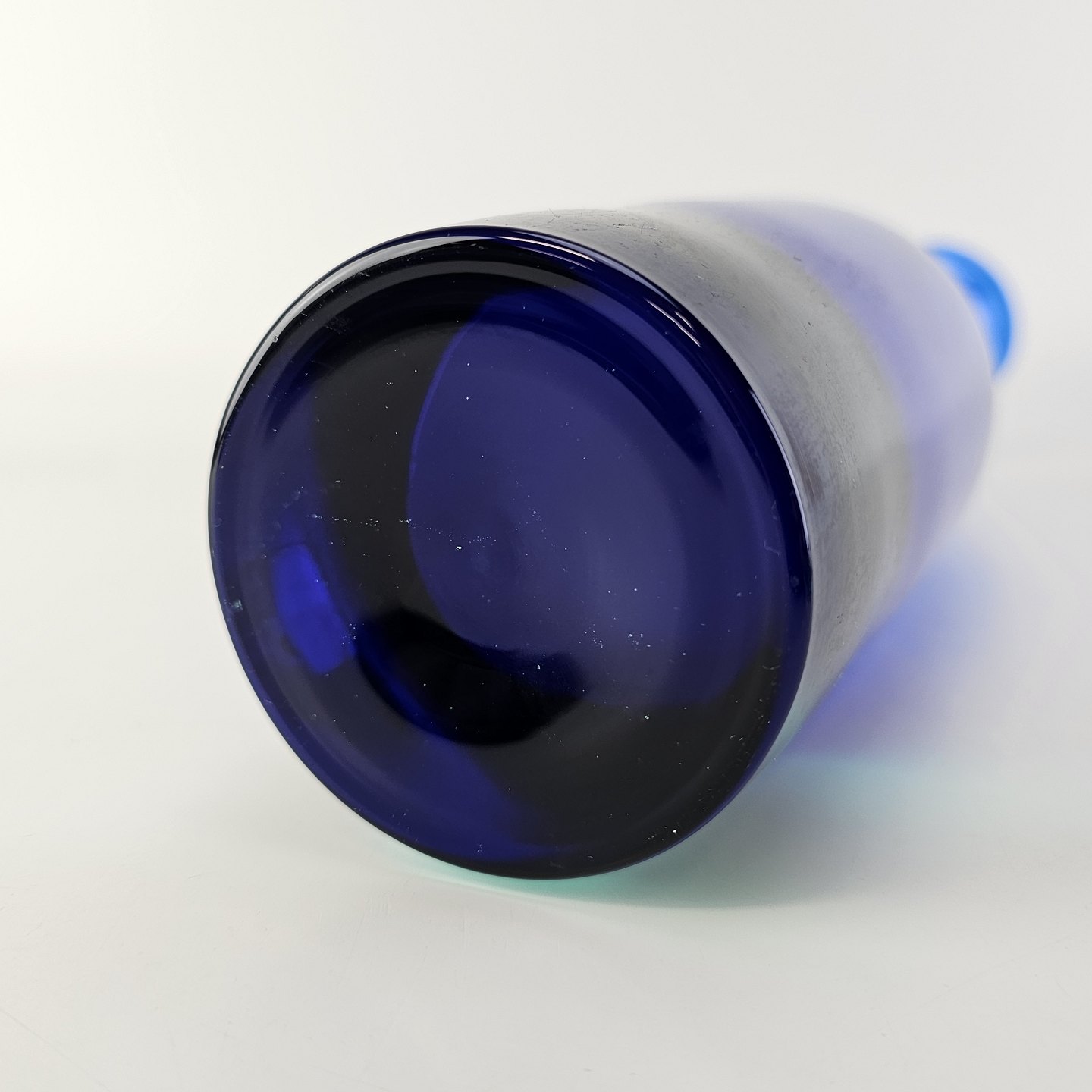 Flaske med prop af blåt klart glas, bund og prop i lysere glas fra serien Harlekin.