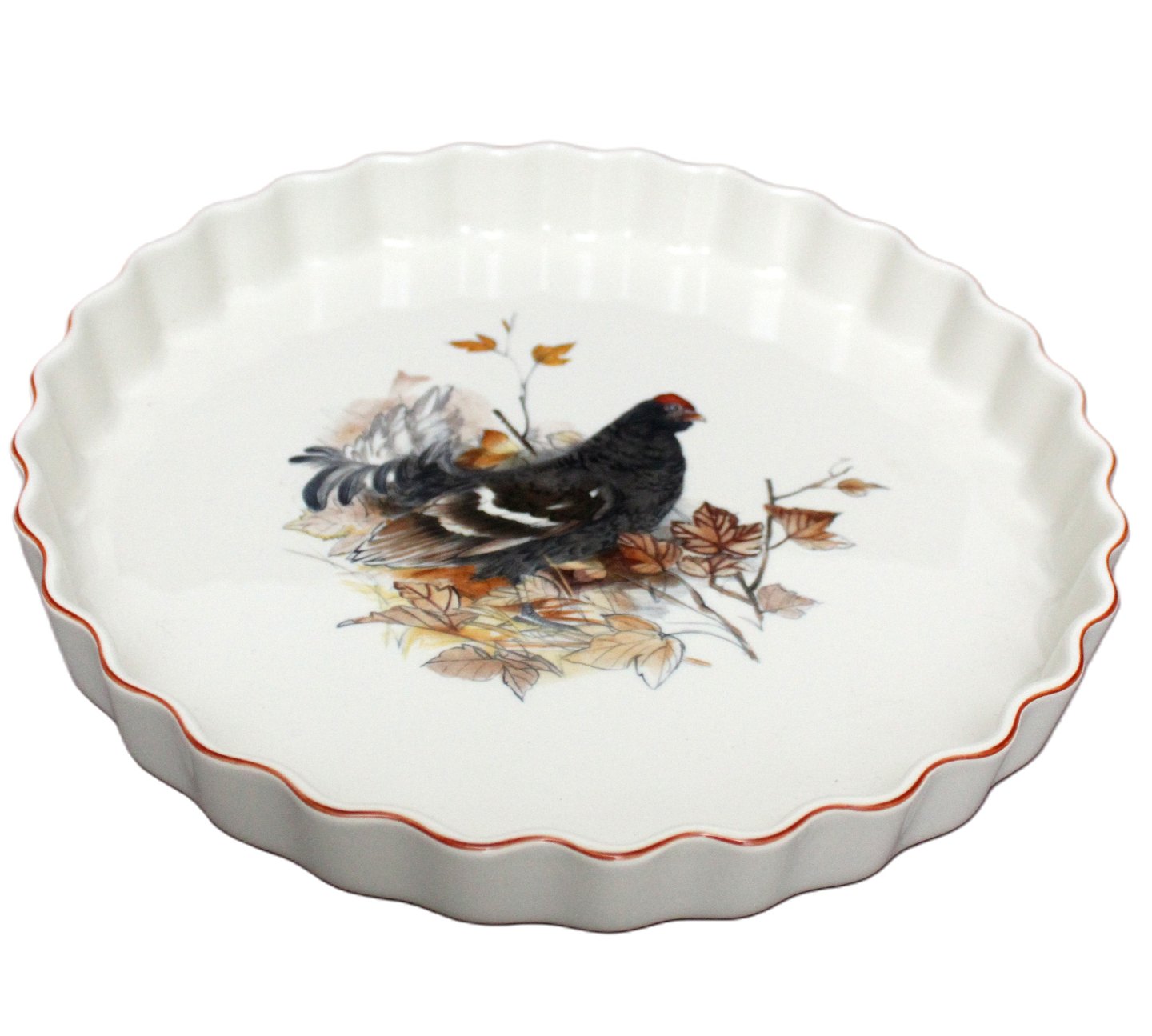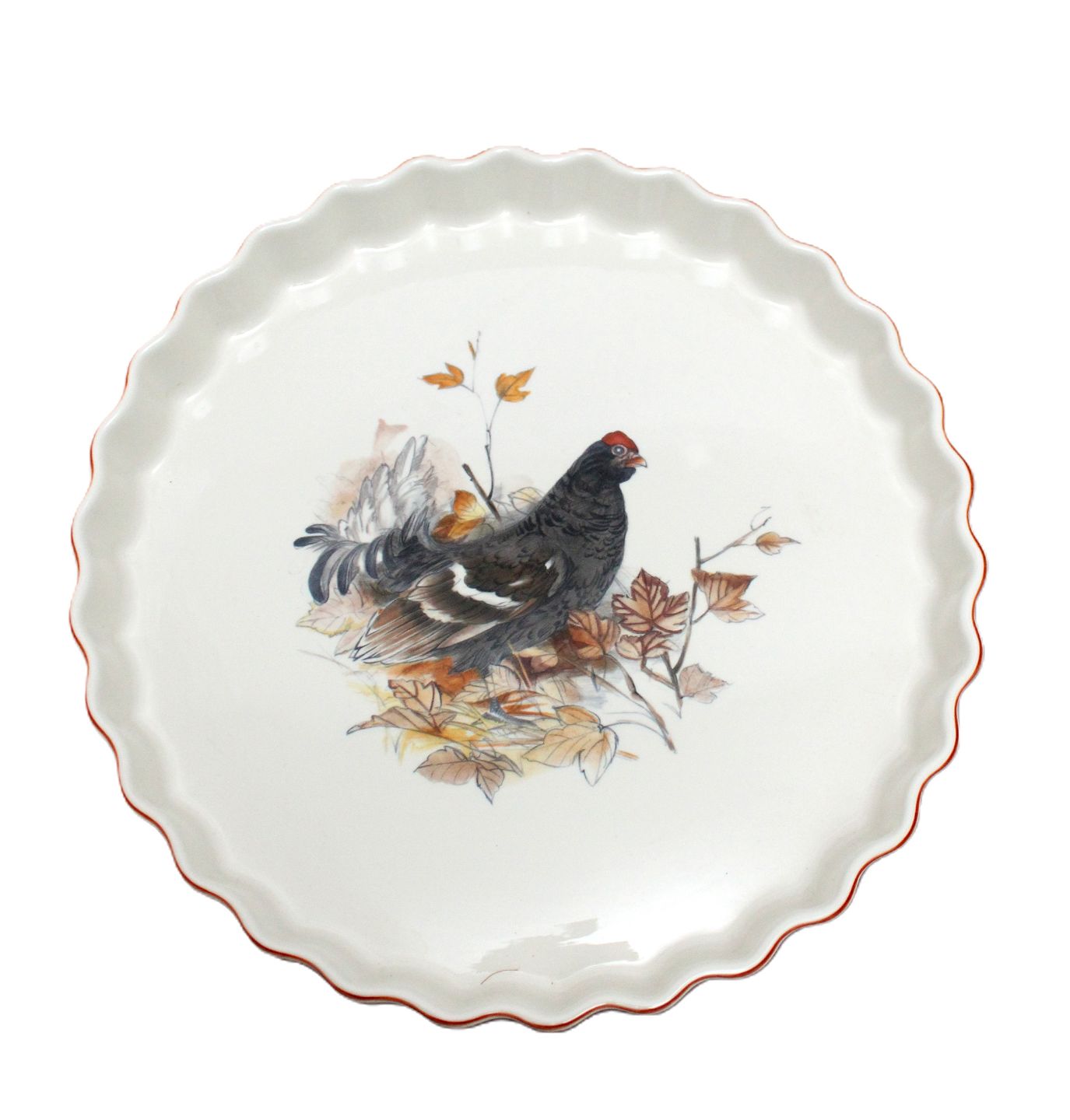 Text available in Danish: Villeroy & Boch, Jagtstellet designet af Mads Stage for Imerco. Stort Tærtefad med Urfugl. Fadet har en mere cremet farve end resten af Mads Stage stellet og er produceret af Villeroy & Boch. Fadet er ovnfast, tåler microovn og opvaskemaskine. Diameter 30 cm. Højde 4 cm. Flot ubrugt stand. Pris: 750 kr. Lager: 1