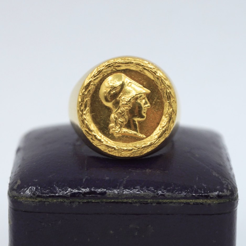 Frantz Hingelberg; Danish doctoral ring of 14k gold. Front in 23k gold with motif of Minerva surrounded by a laurel wreath.The motif of Athena/Minerva, the Greco-Roman goddess of science, has been used for doctoral rings in Denmark since 1866.