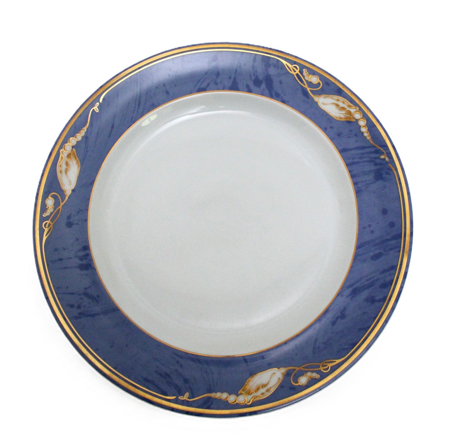 Text available in Danish: Royal Copenhagen, Blå Magnolia. Dækketallerken eller megastor middagstallerken. Blå marmoreret bort dekoreret med gylden blomsterknop. Designet af Flemming Eskildsen. Nr. 631. Diameter 31,5 cm. I. sortering. Flot stand. Pris: 300 kr. stk. Lager: 16