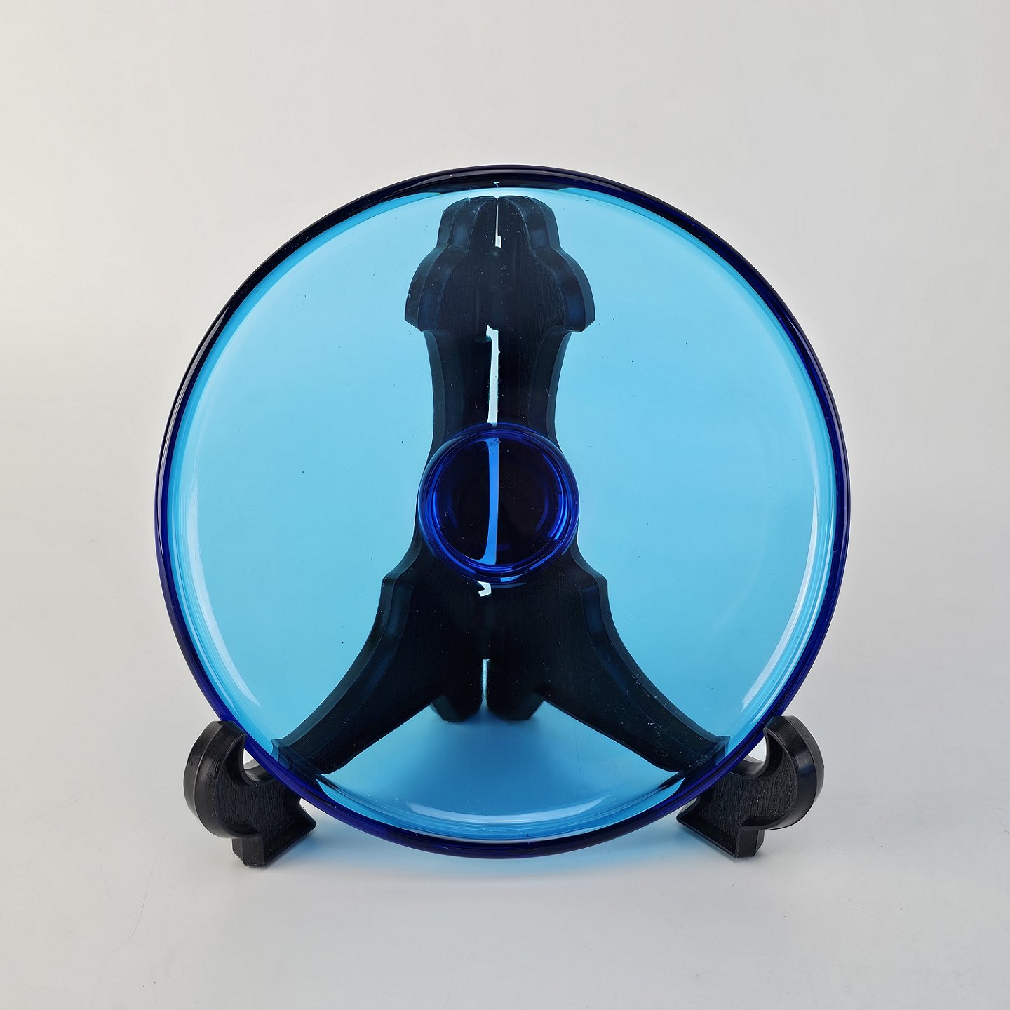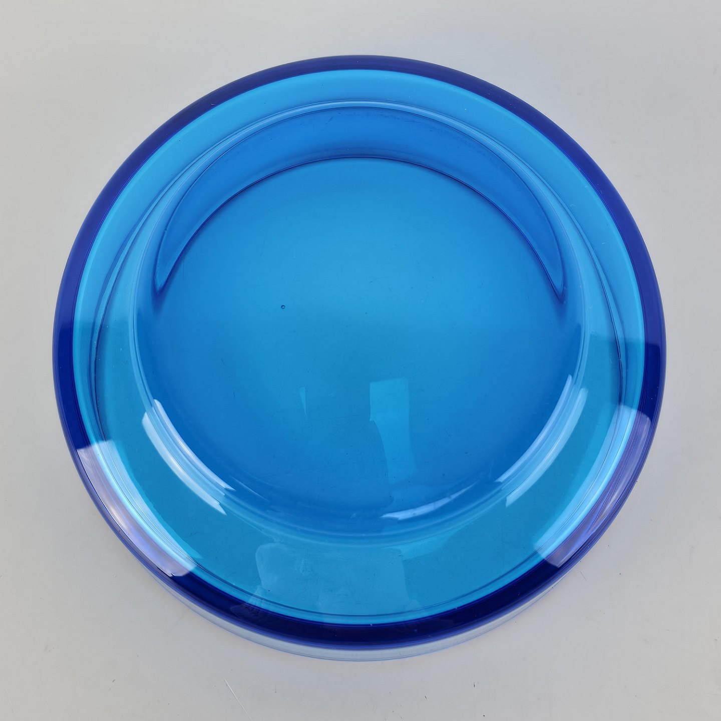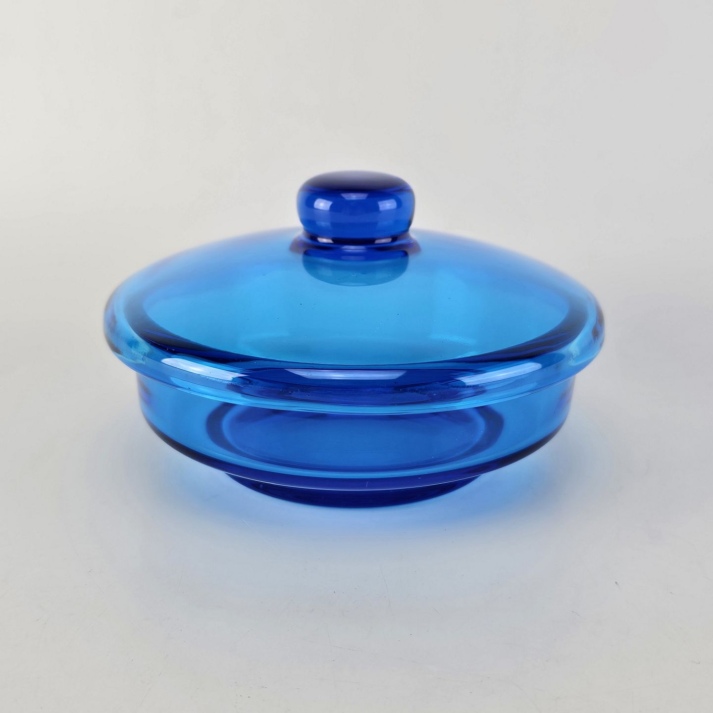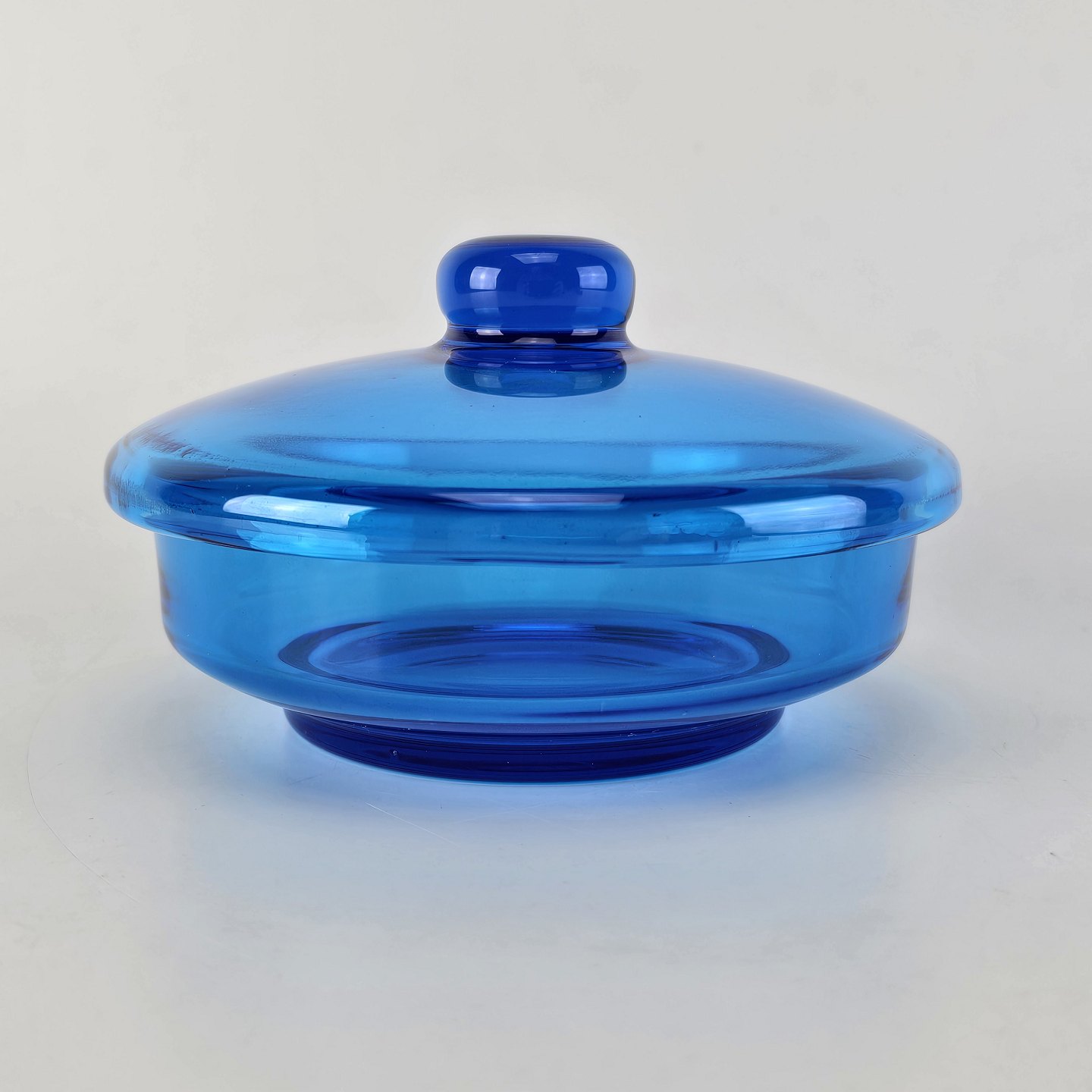 Skål i klart blåt glas med låg