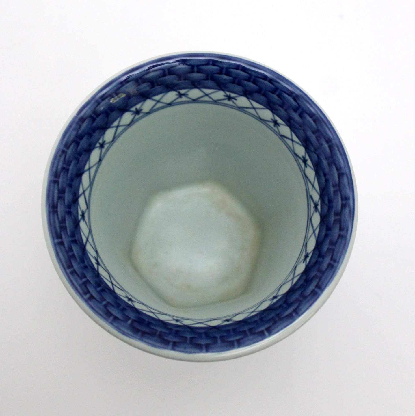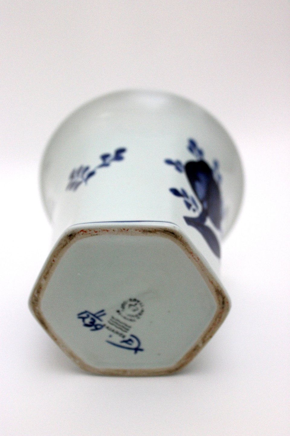 Text available in Danish: Aluminia, Tranquebar lyseblå fajance med mørkeblå tulipan og flettet bort designet af Christian Joachim. Produceret fra 1914 til 1969, hvor det overgik til Royal Copenhagen. Håndmalet. Sekskantet vase med rund krave. Nr. 11/1239. 14 x 15 cm. Højde 10,5 cm. Øverste diameter 11,3 cm. Flot stand med brugsspor nederst i bund indvendig. I. sortering. Pris: 300 kr.
