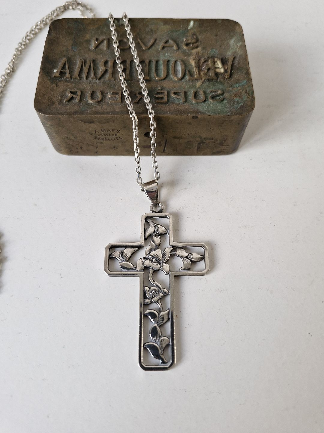 Silver necklace with large silver cross. The cross is decorated with flowers and designed by Eiler & Marløe.