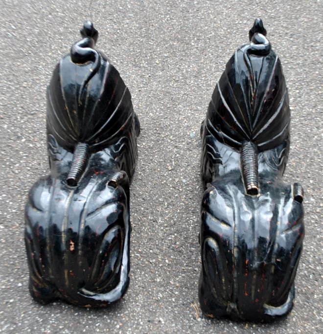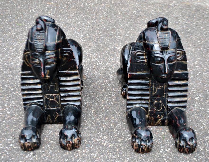 Pair of large decorative black-painted wooden sphinxes, 20th century, Egypt. L.: 65 cm. W.: 22 cm. H.: 44 cm.