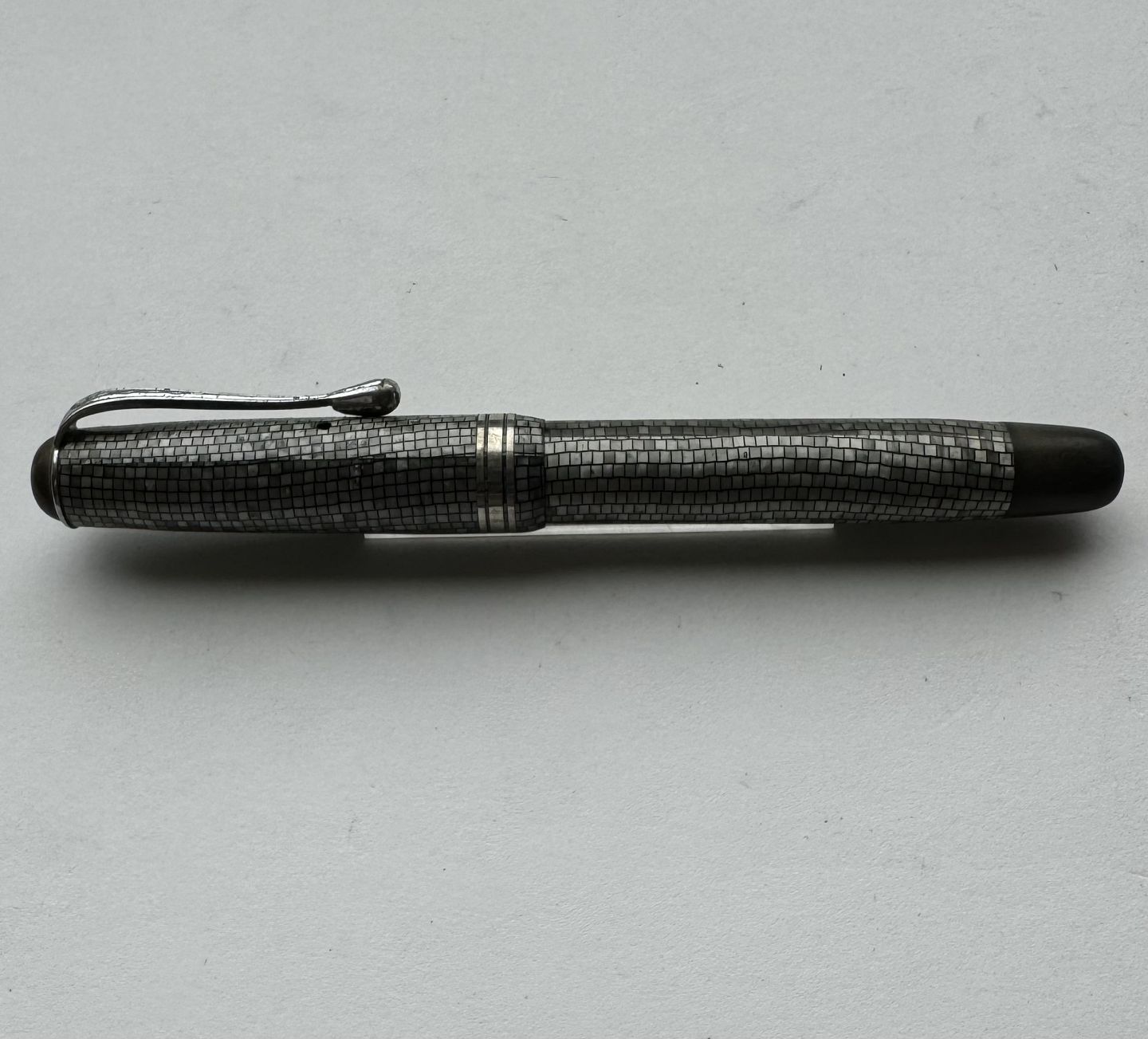 Small Penol fountain pen in “snakeskin” made in Denmark around 1940. Appears in good condition without damage or repairs. All parts are original to this model including a 14 carat Penol Gold nib. Does not work. A new rubber sack must be inserted before the pen can absorb ink and write again. Dimensions: 11.2 cm.