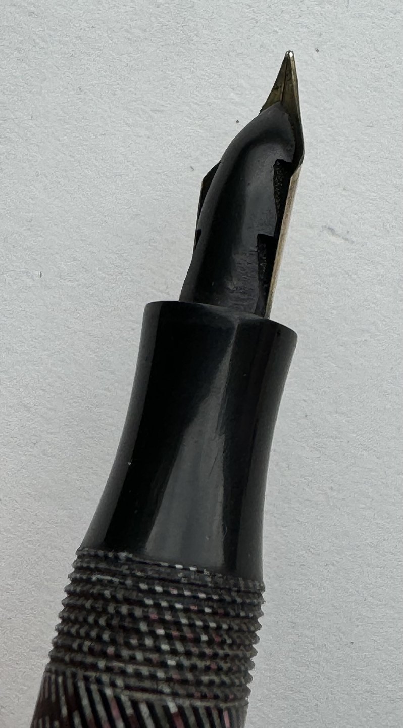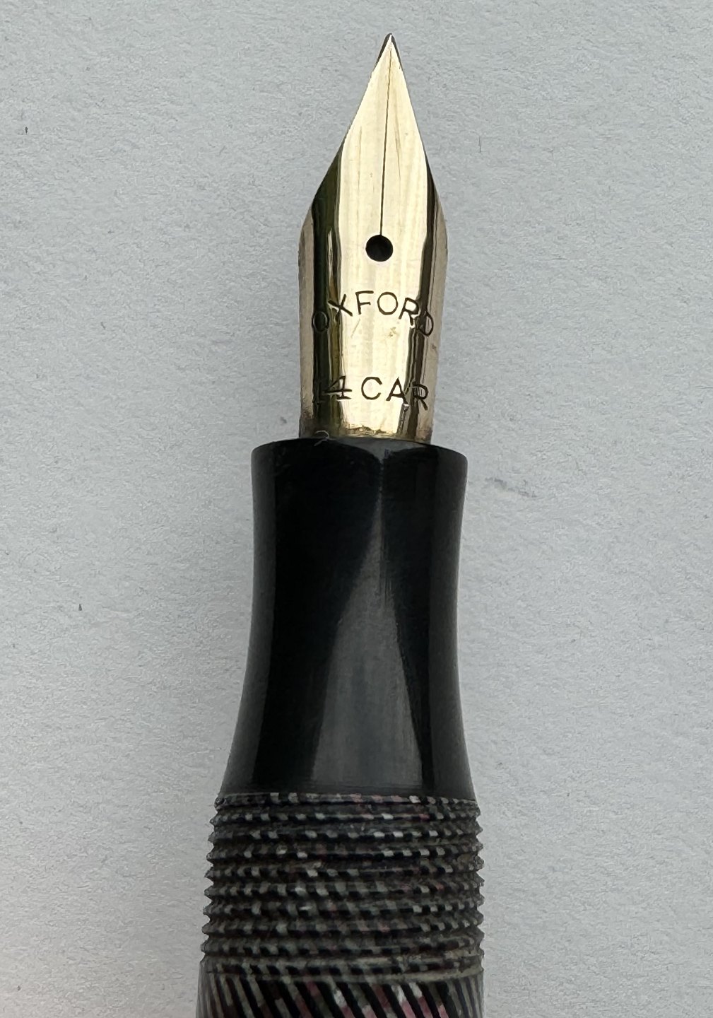 Silver and green spiral striped Sheffield Pen fountain pen made in the 1940s. The nib is a 14 carat gold nib from Oxford. Possibly a Danish product. For example, it has similarities to fountain pens made by Penol. Appears in good condition. Does not work. A new rubber sack must be inserted before the pen can absorb ink and write again. Dimensions: 12.2 cm