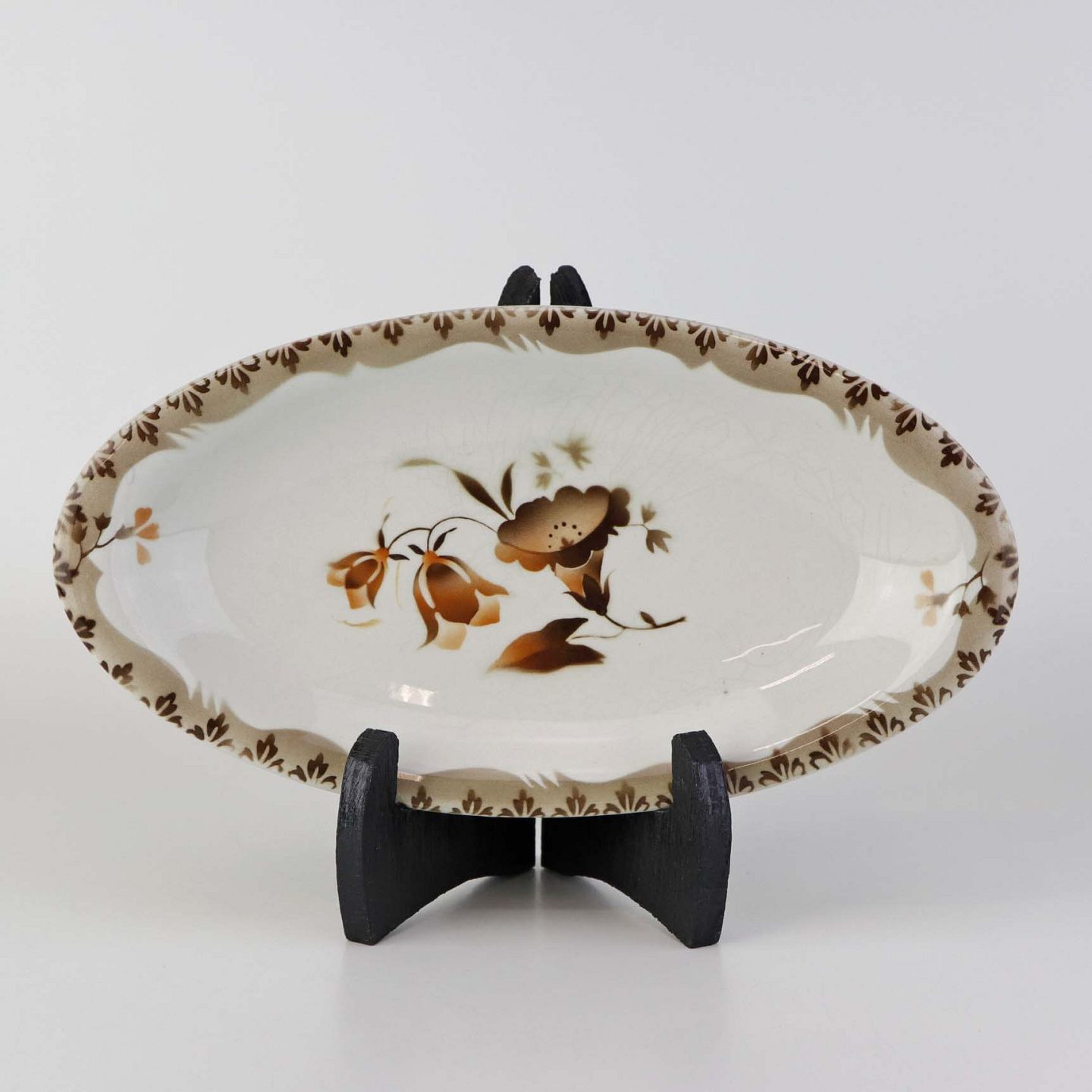 Stel i glat hvid fajance i stelform C med dekoration af brune snerleblomster og lysebrun kant med bladmotiv. Stellet blev produceret i perioden år 1930-1941