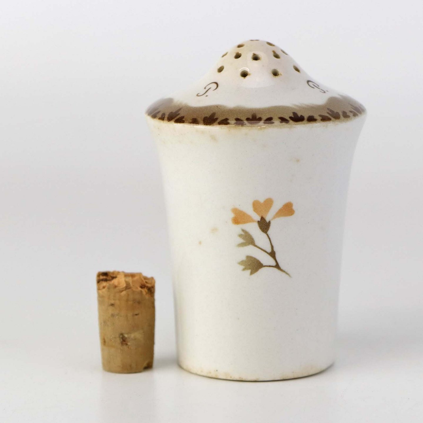 Text available in Danish: Peber strø i fajance med korkprop fra stellet Convolvulus Snerle.