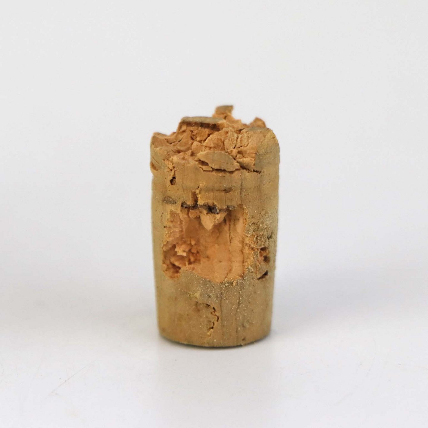 Fremstår med mørkninger under glasuren og brugsspor på korkproppen