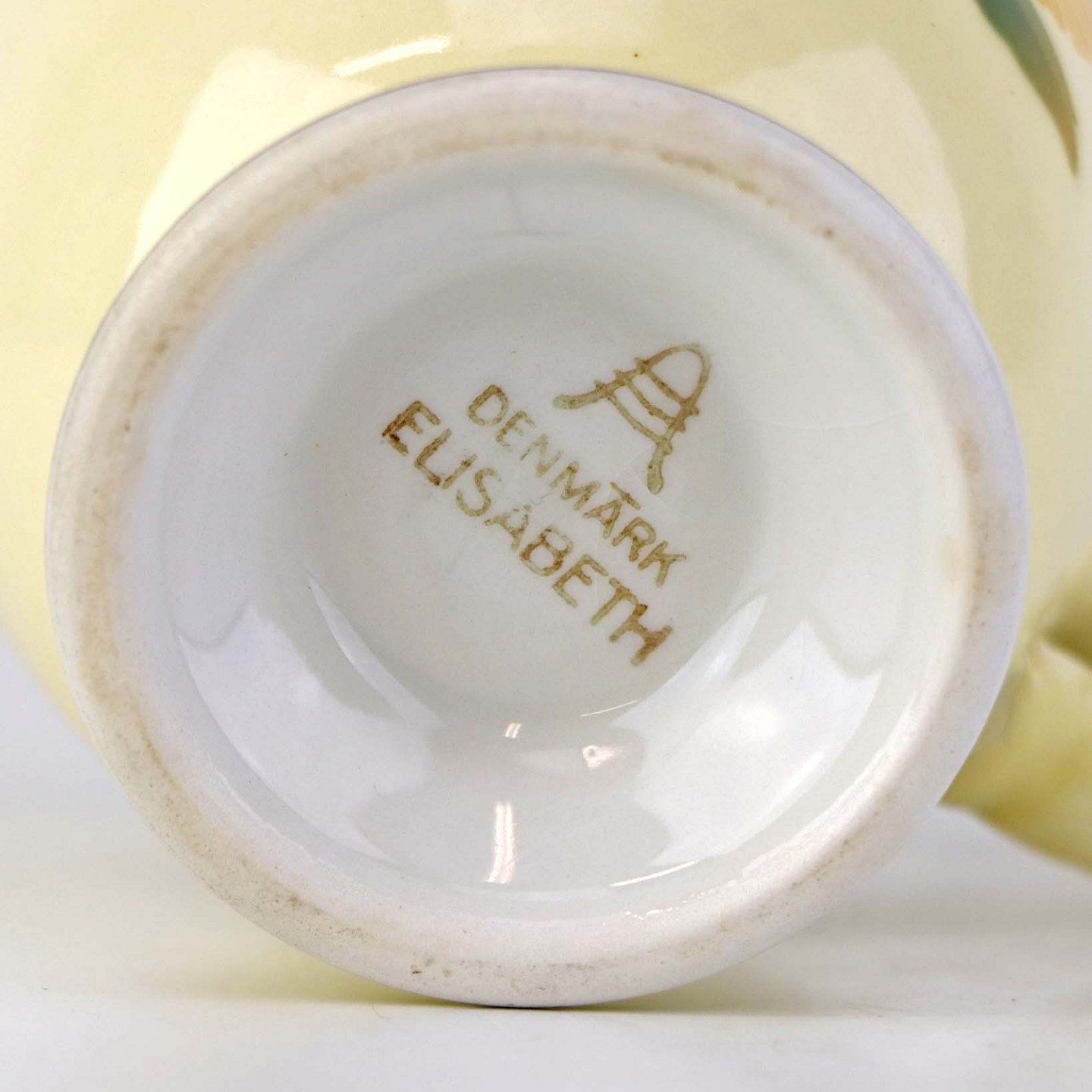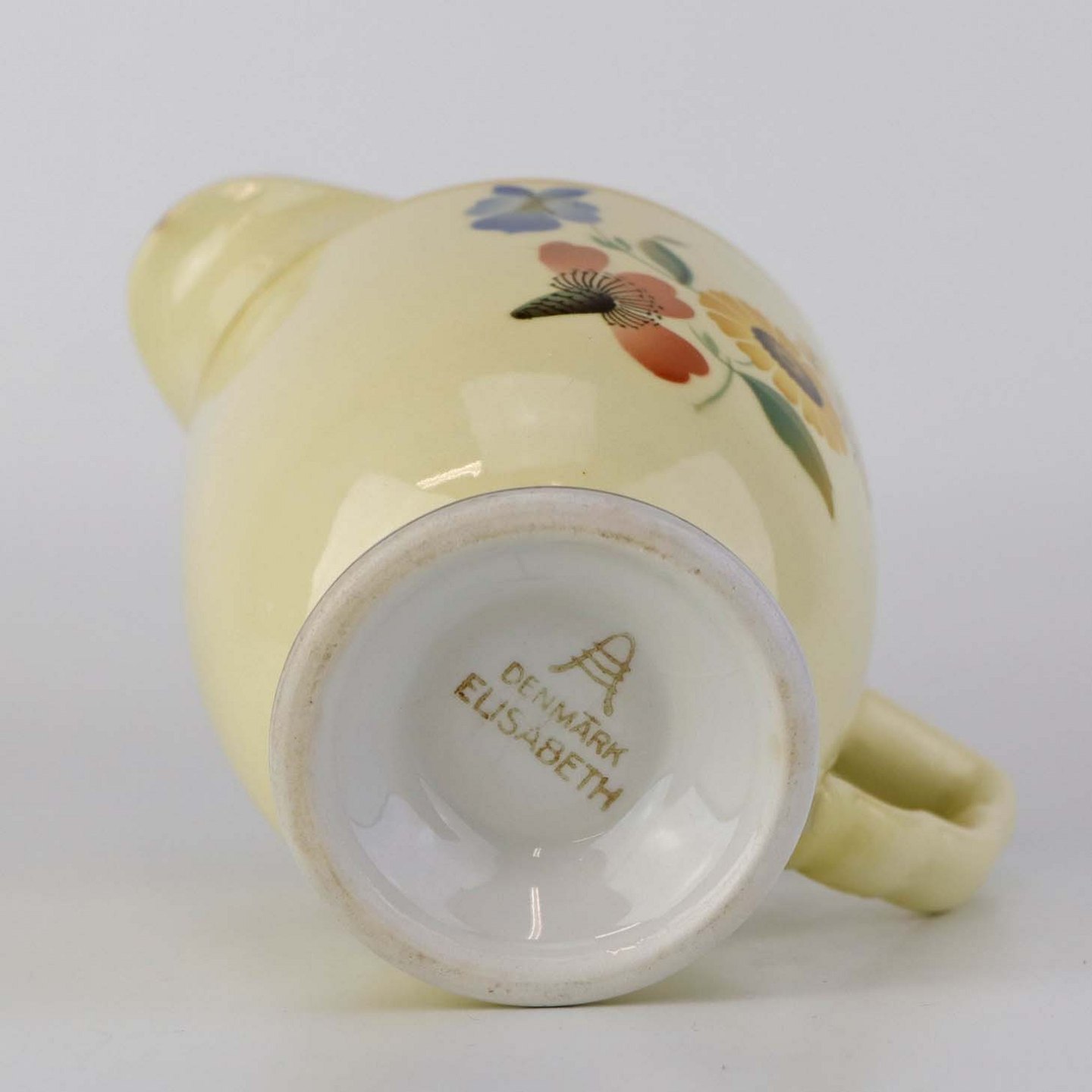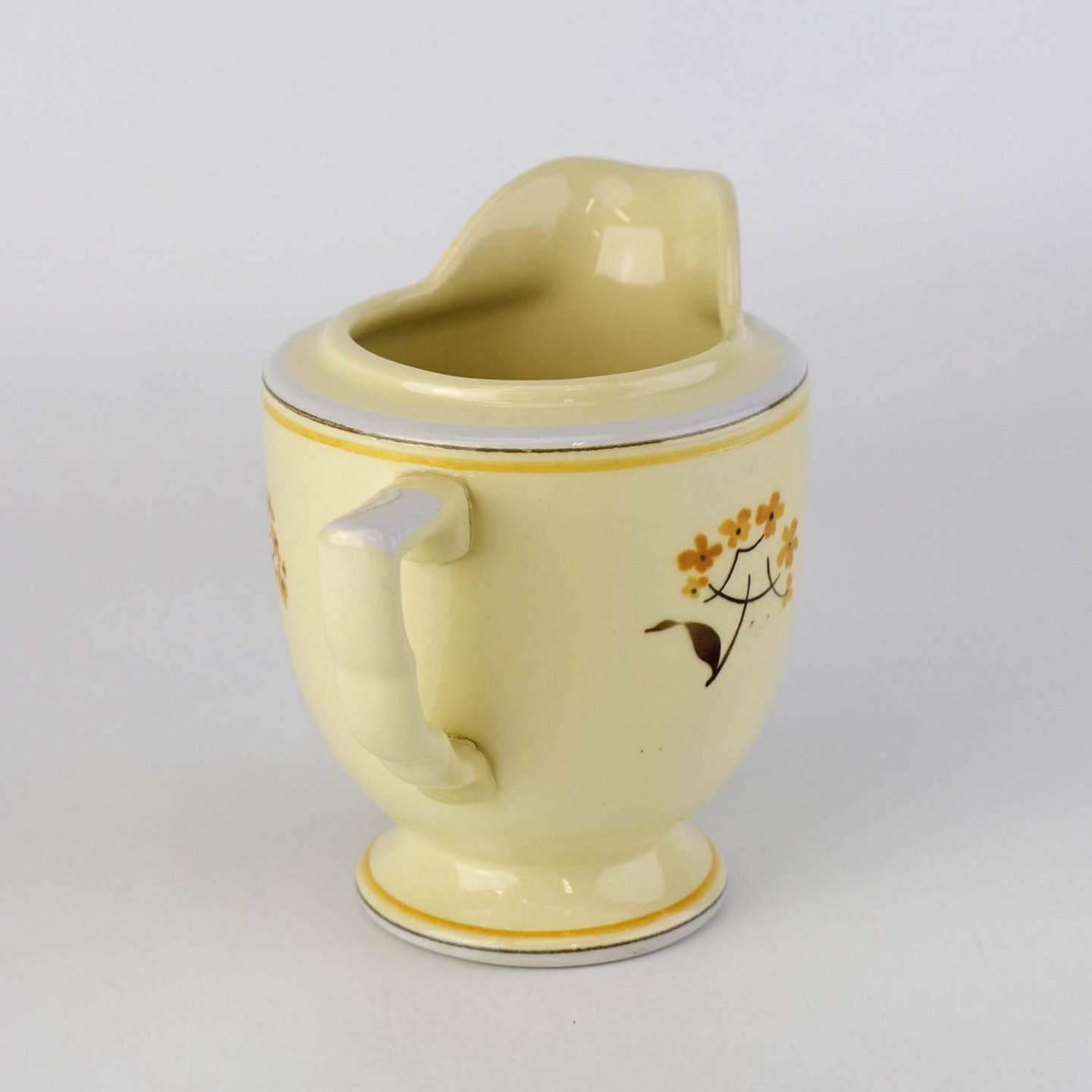 Stel i glat gul fajance med dekoration af farverige og forskelligartede blomster samt med gul og sort kantstreg.
