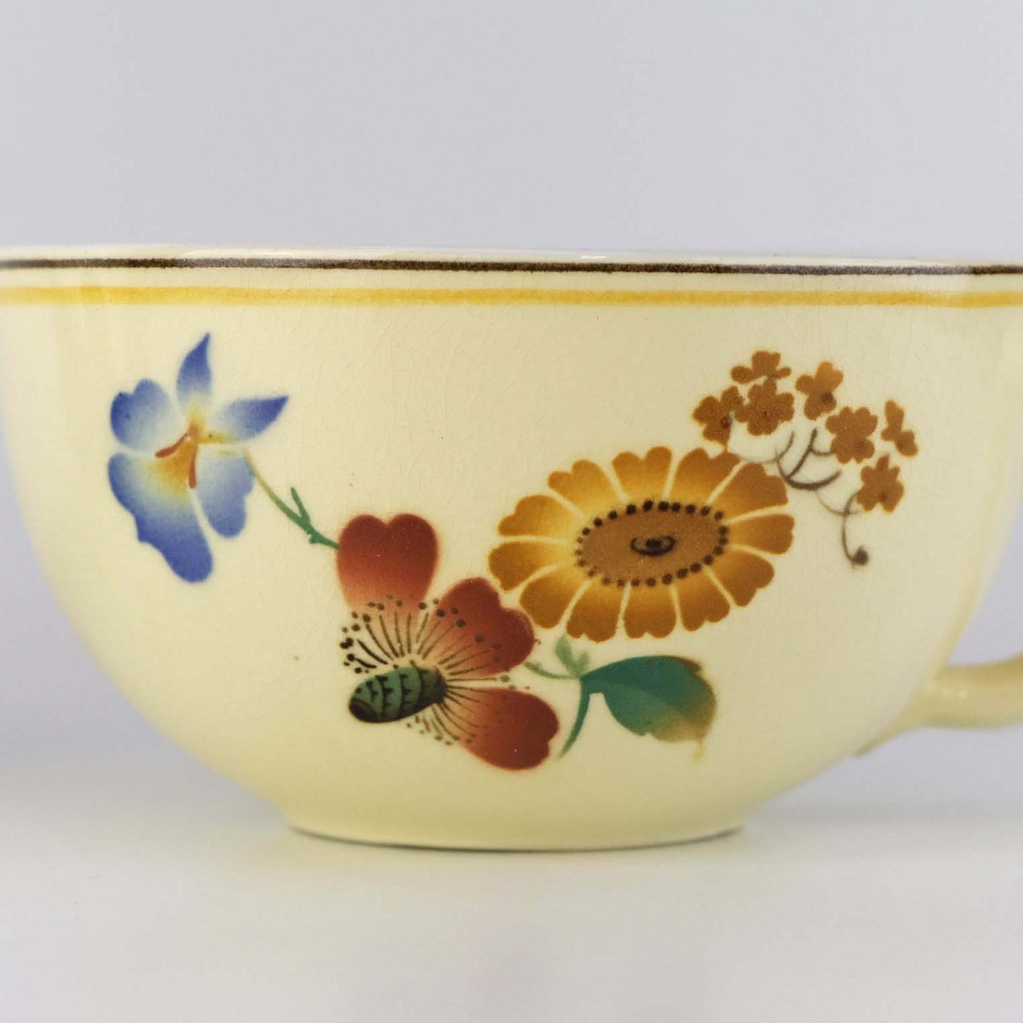 Stel i glat gul fajance med dekoration af farverige og forskelligartede blomster samt med gul og sort kantstreg.