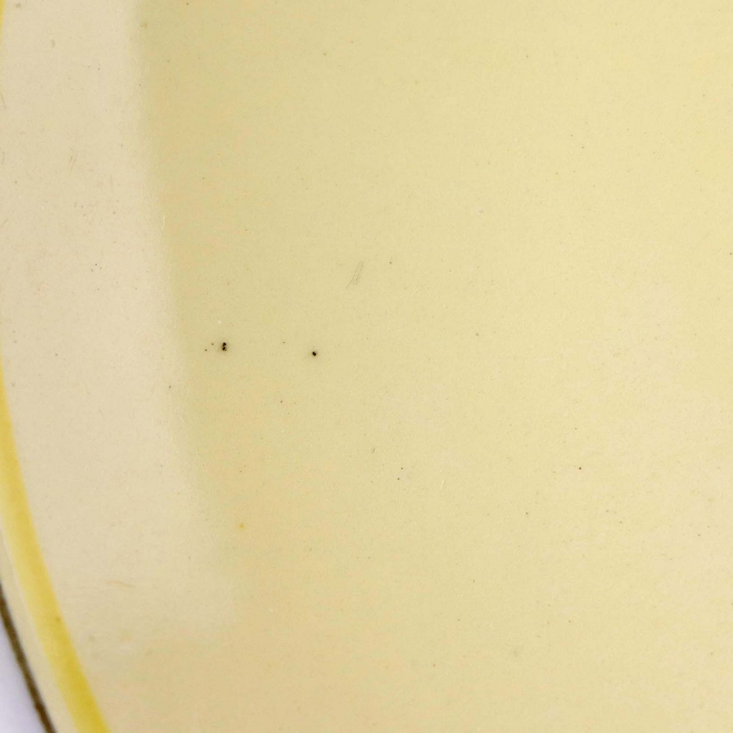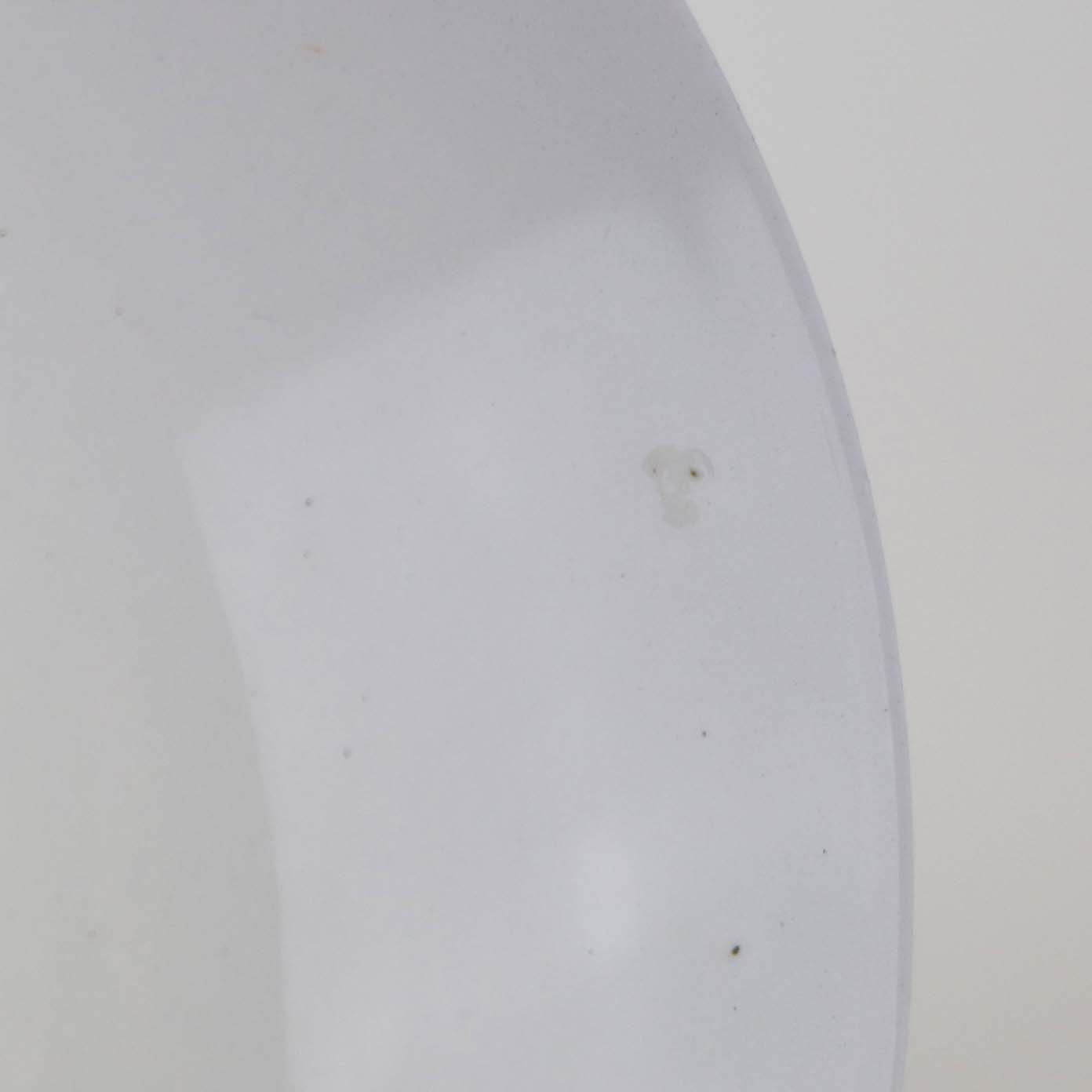 Fremstår med krakkeleringer og mindre sorte nister i glasuren samt ujævnt område på bagsiden af underkoppen.