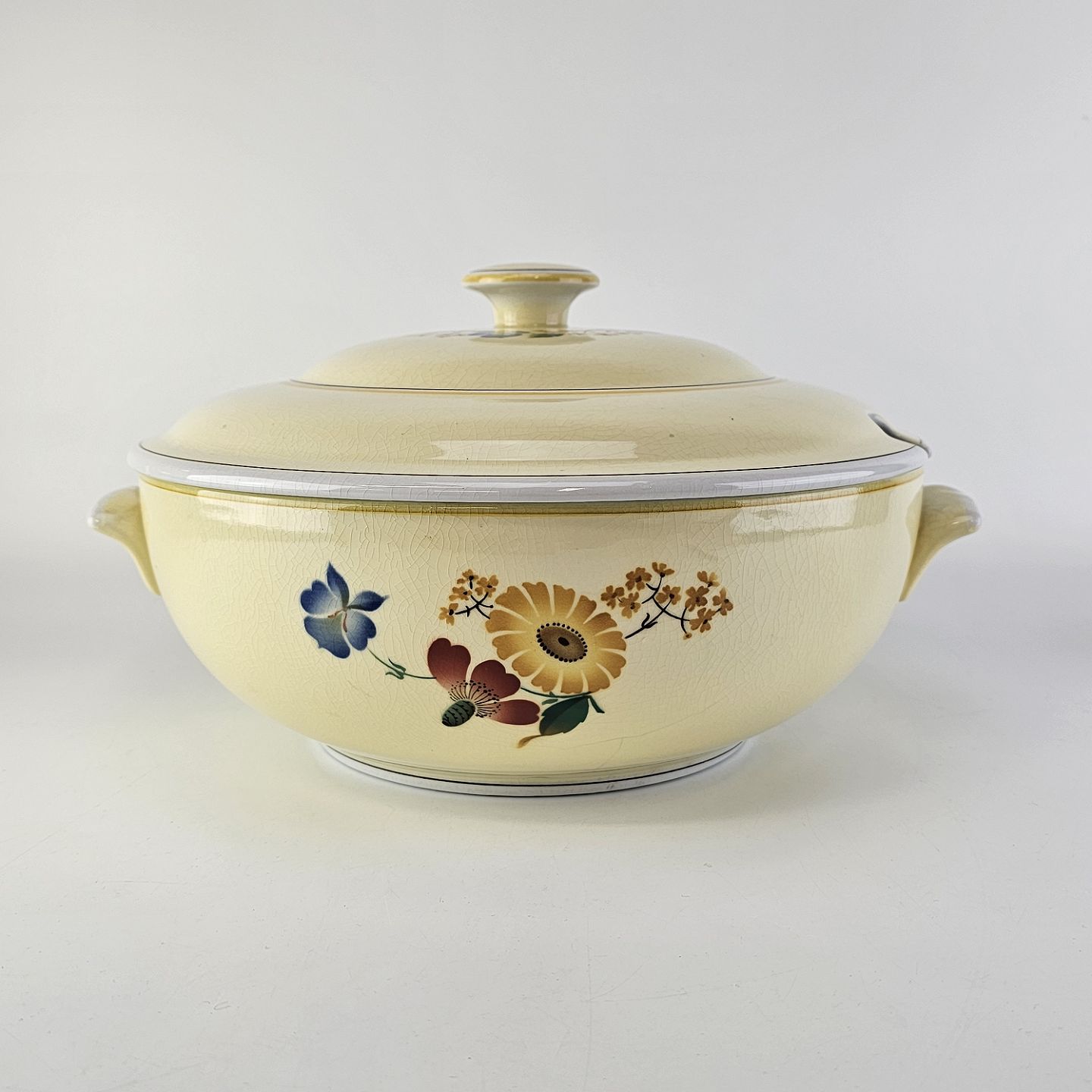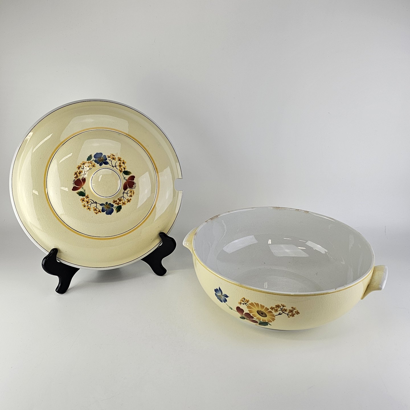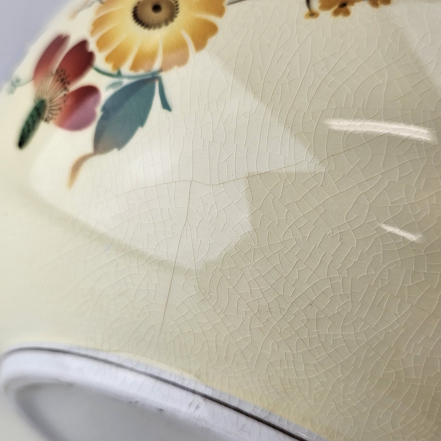 Stel i glat gul fajance med dekoration af farverige og forskelligartede blomster
