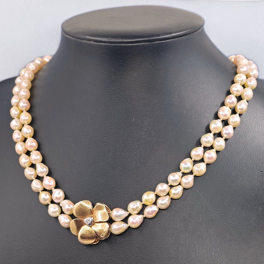Ole Lynggaard, Charlotte Lynggaard; Clasp of 14k gold set with a diamonds, and pearl chain
