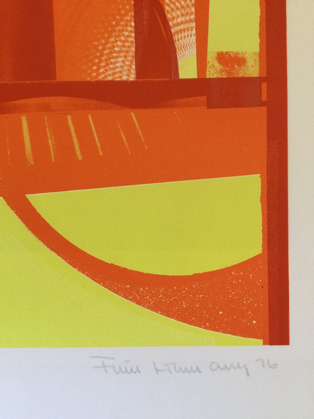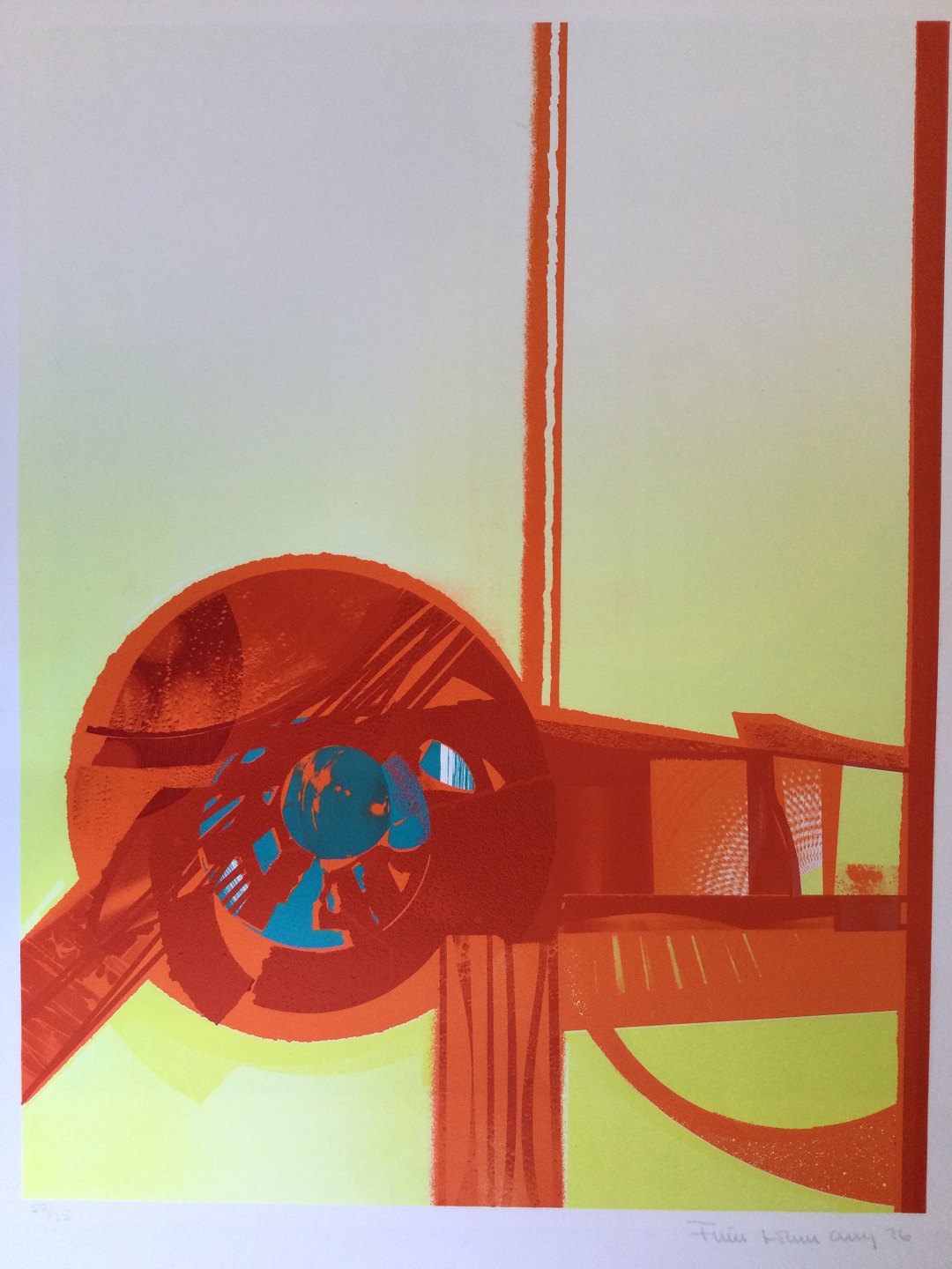 Text available in Danish: Farvelitografi af Finn Lohmann - Komposition 1976.