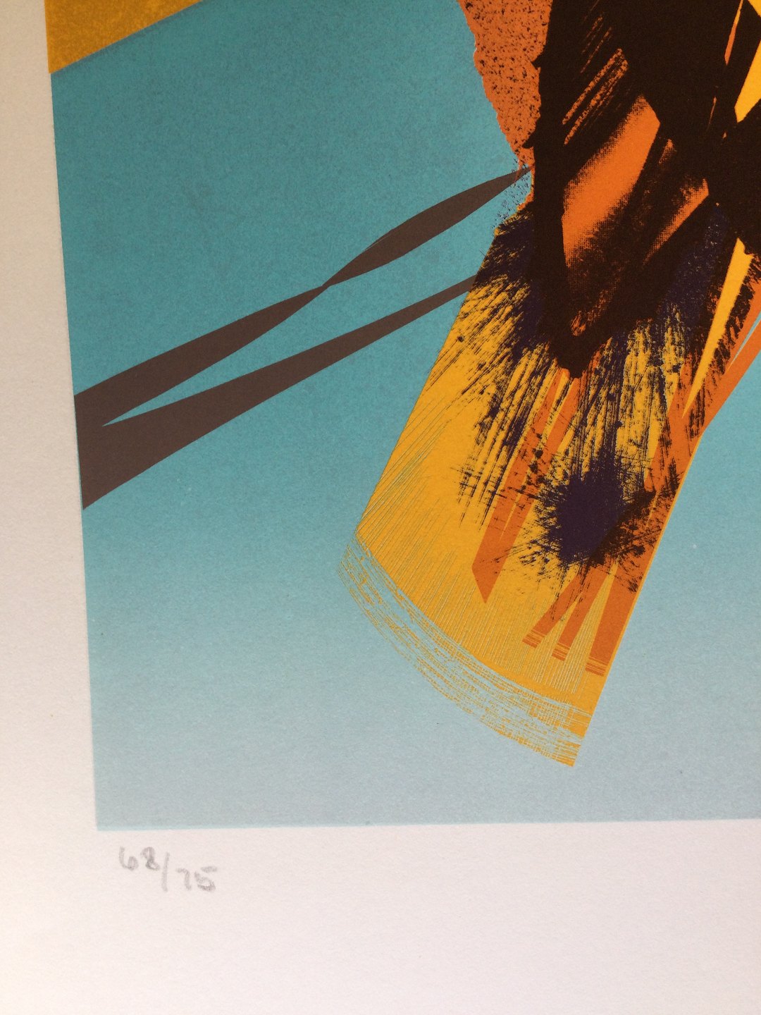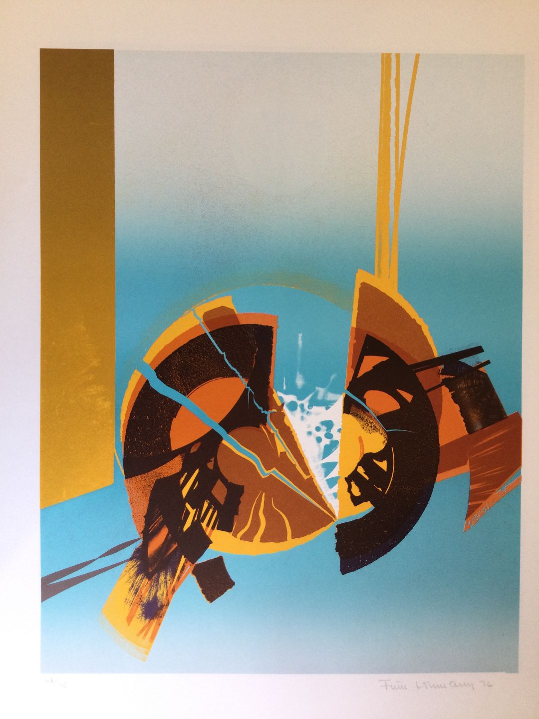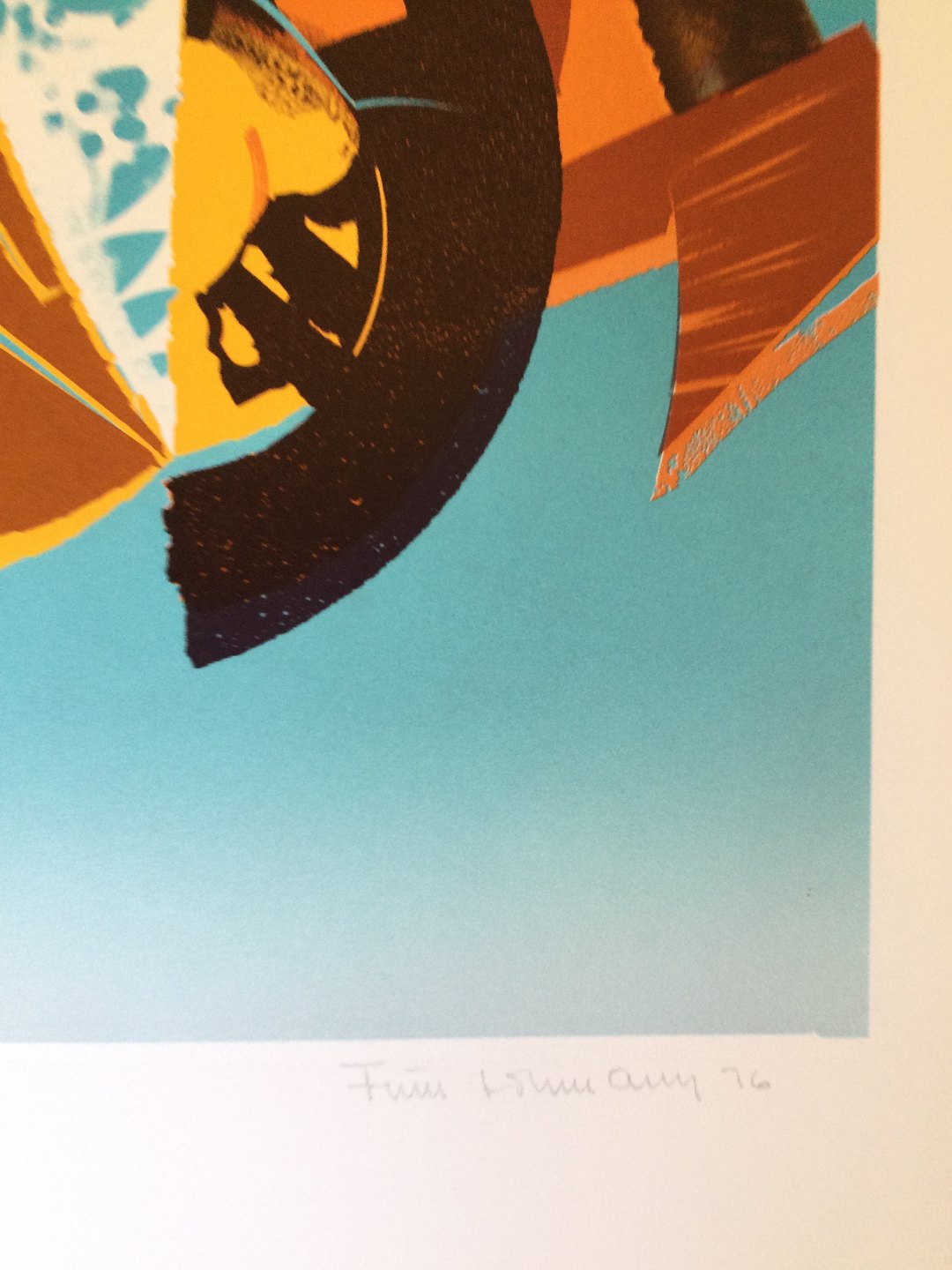 Text available in Danish: Farvelitografi af Finn Lohmann - Komposition 1976.