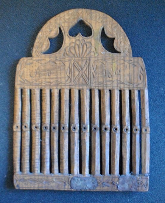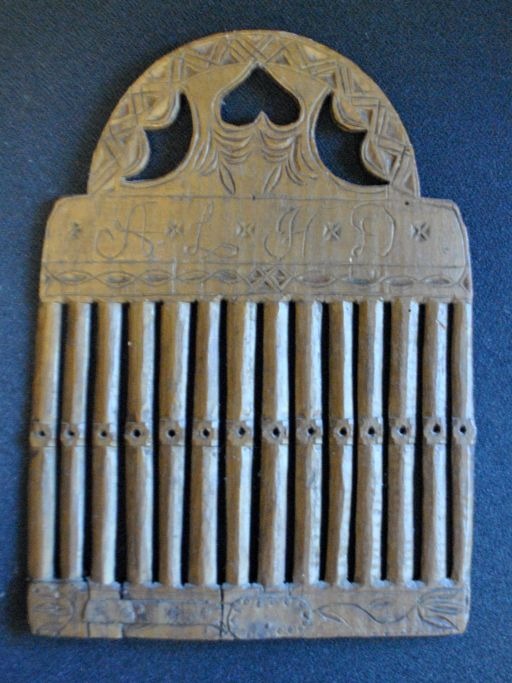Antique Danish weaving heddle in painted beech, 1811. Partially bronzed on one side. With carved heart and the intivals: ALHD 26 x 19 cm.
