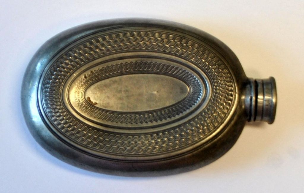 Pewter pocket flask, 19th century. With decorations. Unmarked. 11.5 x 7.5 cm.