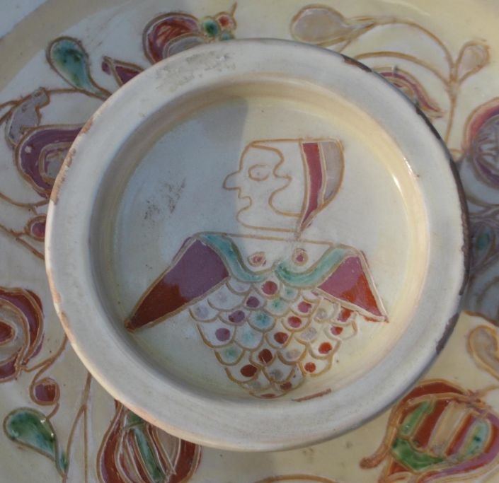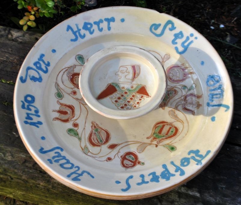 North German double dish, 20th century. Earthenware with glaze and text. Copy of older dish from 1750. Signed. H.: 7 cm. Dia.: 34 cm.