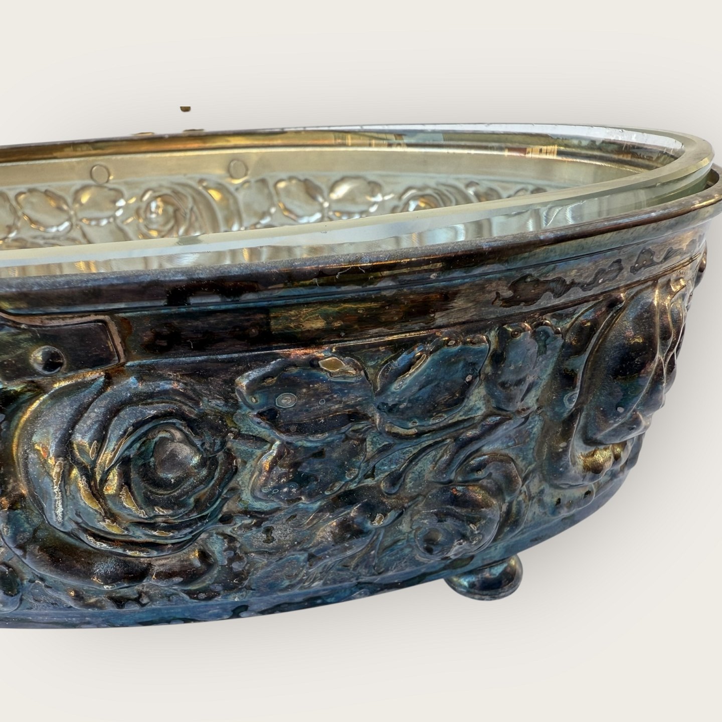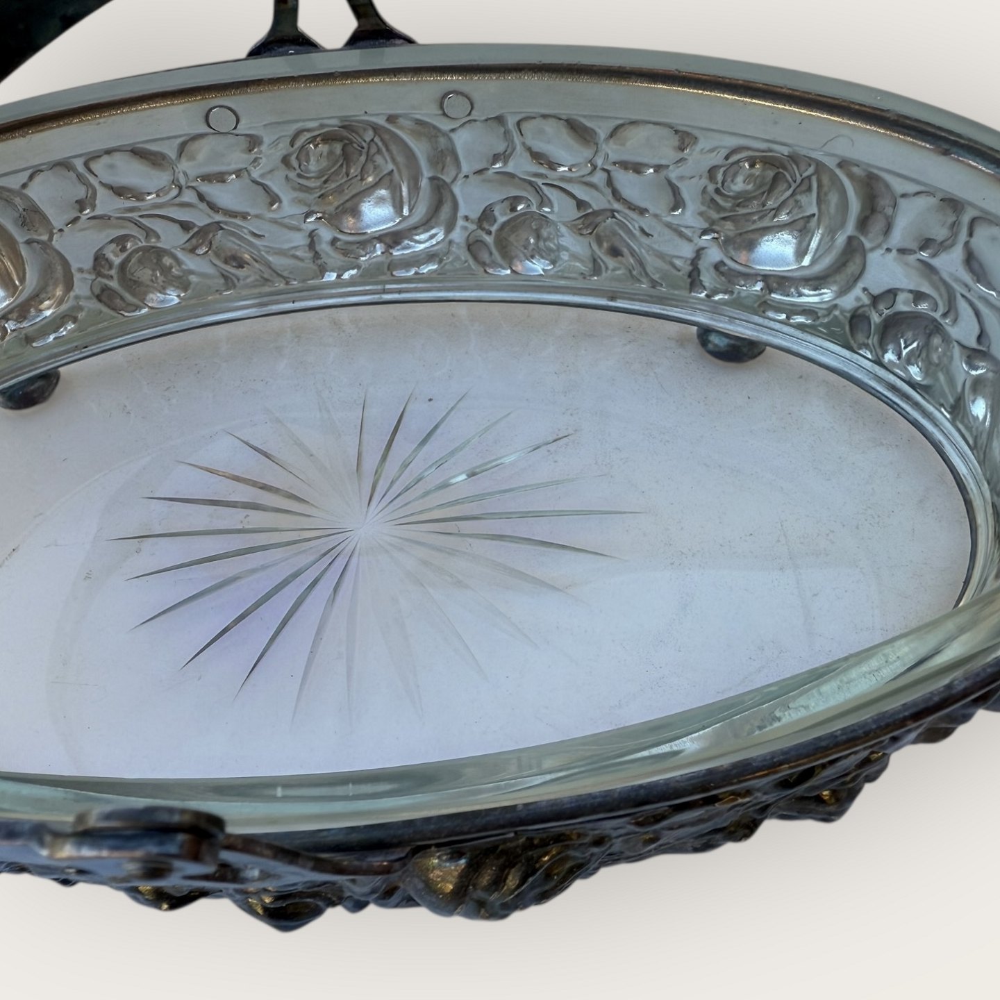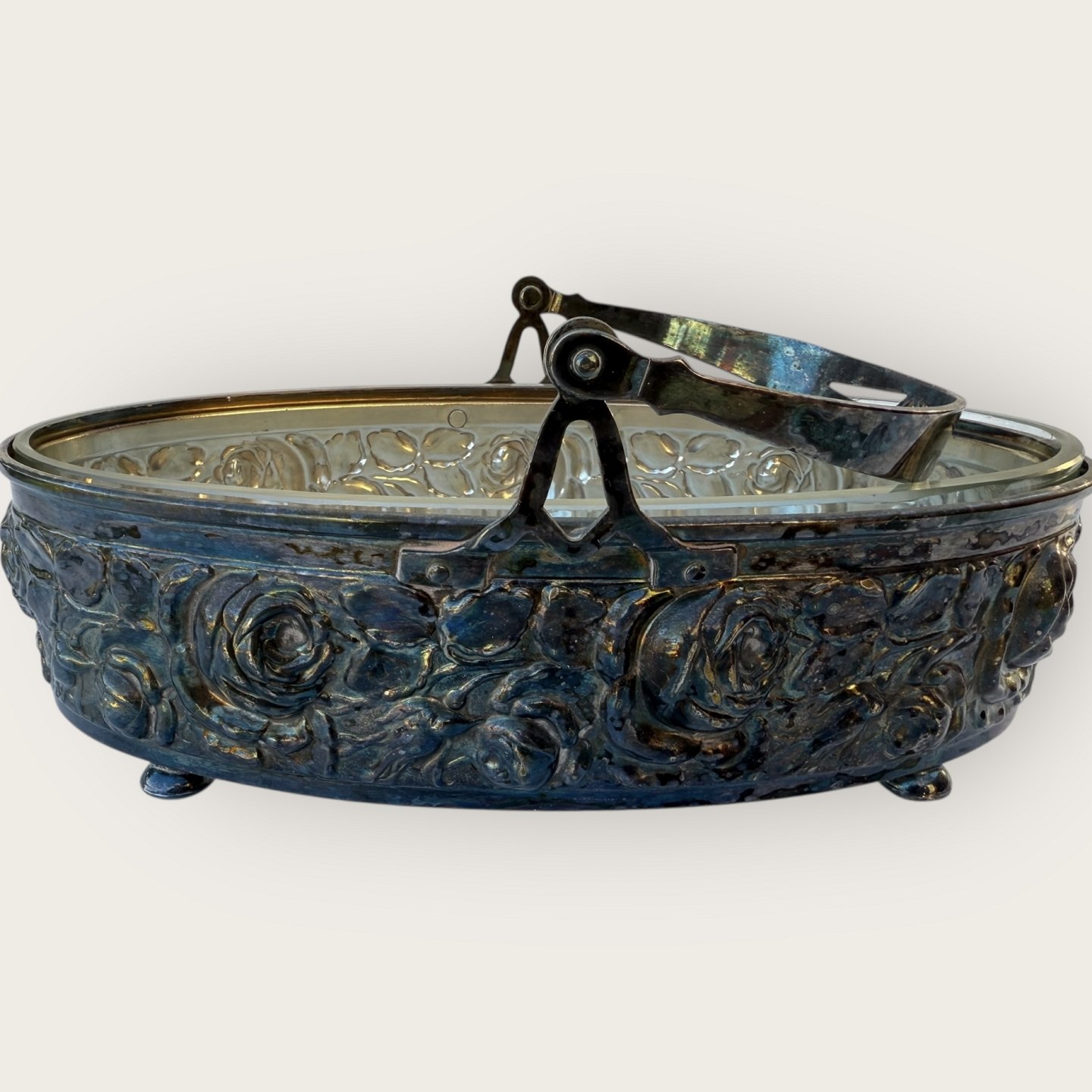 Bowl with glass insert in silver plated with rose decoration and handle, 25x14cm. *Beautiful patinated condition, with beautiful whole glass bowl*