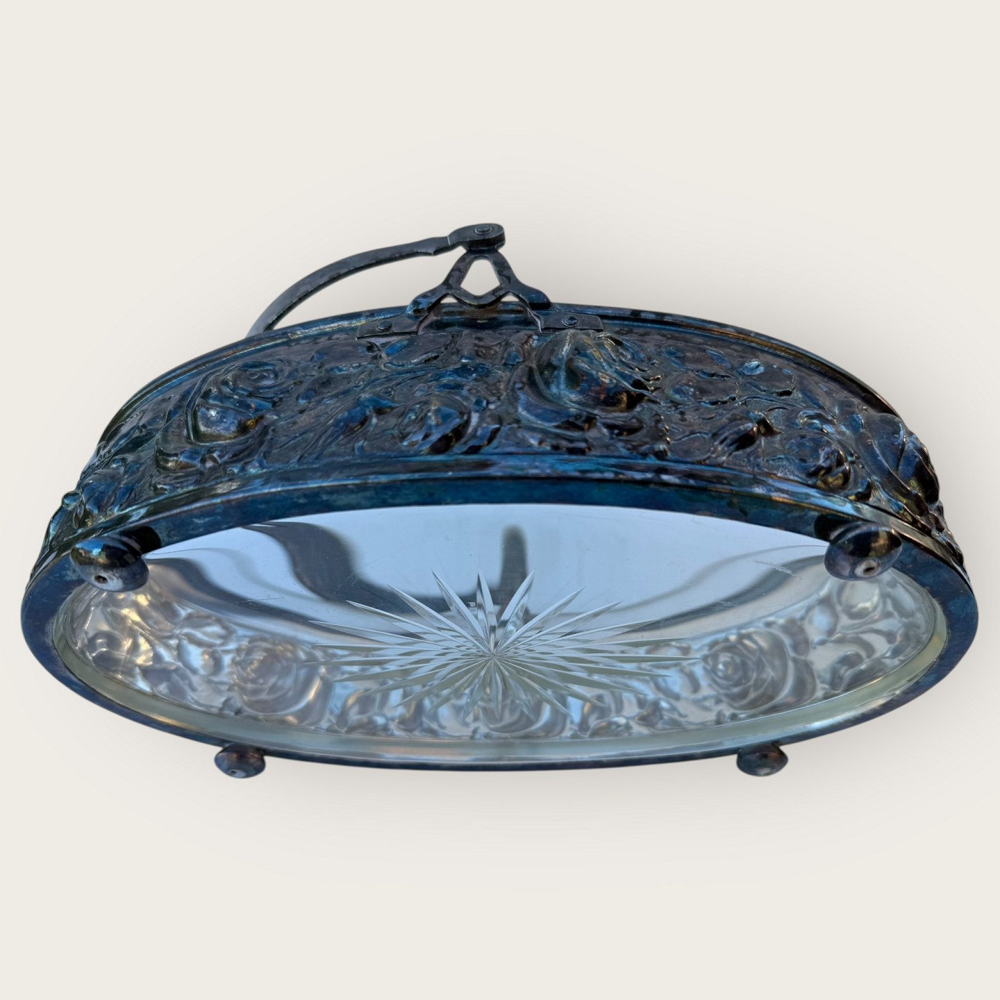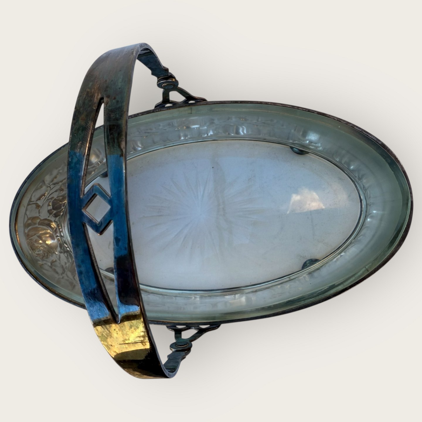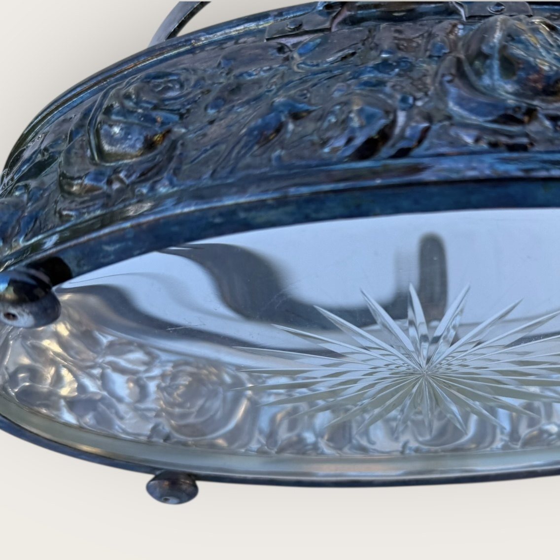 Bowl with glass insert in silver plated with rose decoration and handle, 25x14cm. *Beautiful patinated condition, with beautiful whole glass bowl*