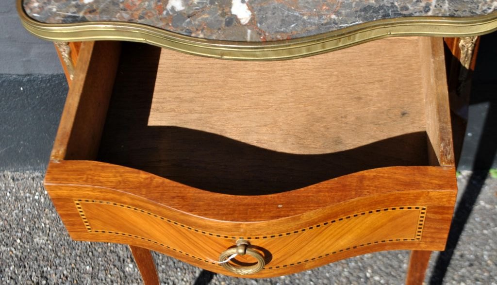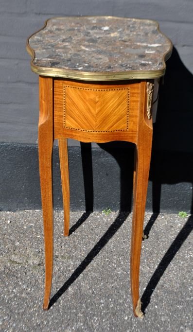 French lamp table, 20th century. With intarsia. With brass edge and variegated marble top. With bronze shoe. H,; 69 cm. W.: 47 cm. D.: 36 cm.