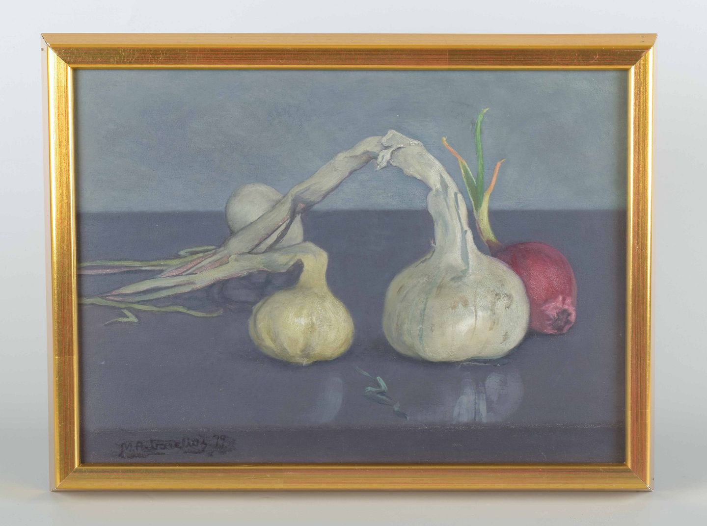 A still life with onions and garlic rendered in muted gray, green, and reddish tones. The composition is simple and precise, with a realistic depiction of organic forms and a calm, almost meditative atmosphere. The work reflects the artist’s attention to detail and the classical painterly discipline of naturalism.