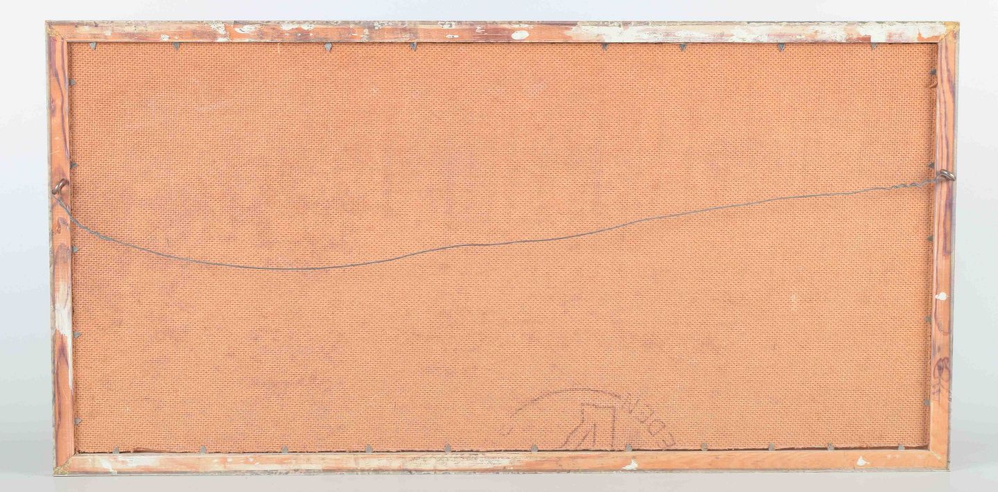 An expressive landscape painting executed in a colorful and simplified style, where blue and violet tones dominate the foreground, while green and yellow fields suggest meadows and vegetation. The painting is characterized by vigorous brushwork and an almost abstract composition, in which natural forms dissolve into rhythmic fields of color.