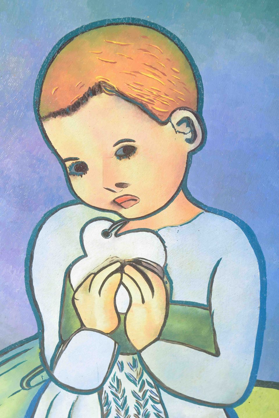 A contemplative figurative painting depicting a child holding a dove, with a colorful ball in the foreground. The composition is simple and characterized by clear contours, calm color fields, and a delicate atmosphere that emphasizes the quiet gravity of the motif.