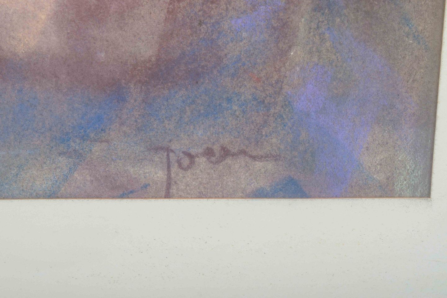 A sensitive and dreamlike portrait in subdued tones, where the soft lines and slightly blurred face lend the image a meditative and almost timeless character. The red headdress provides a warm contrast to the cooler violet and green shades in the background. Jordell’s use of crayon emphasizes the delicate and textural quality that gives the work a particular poetry.