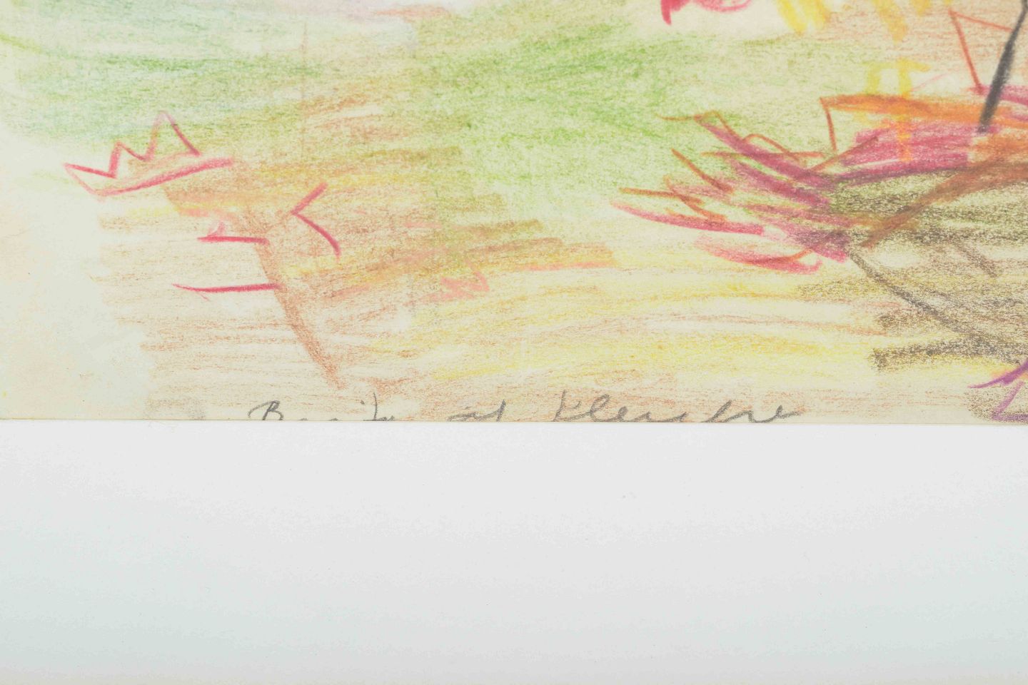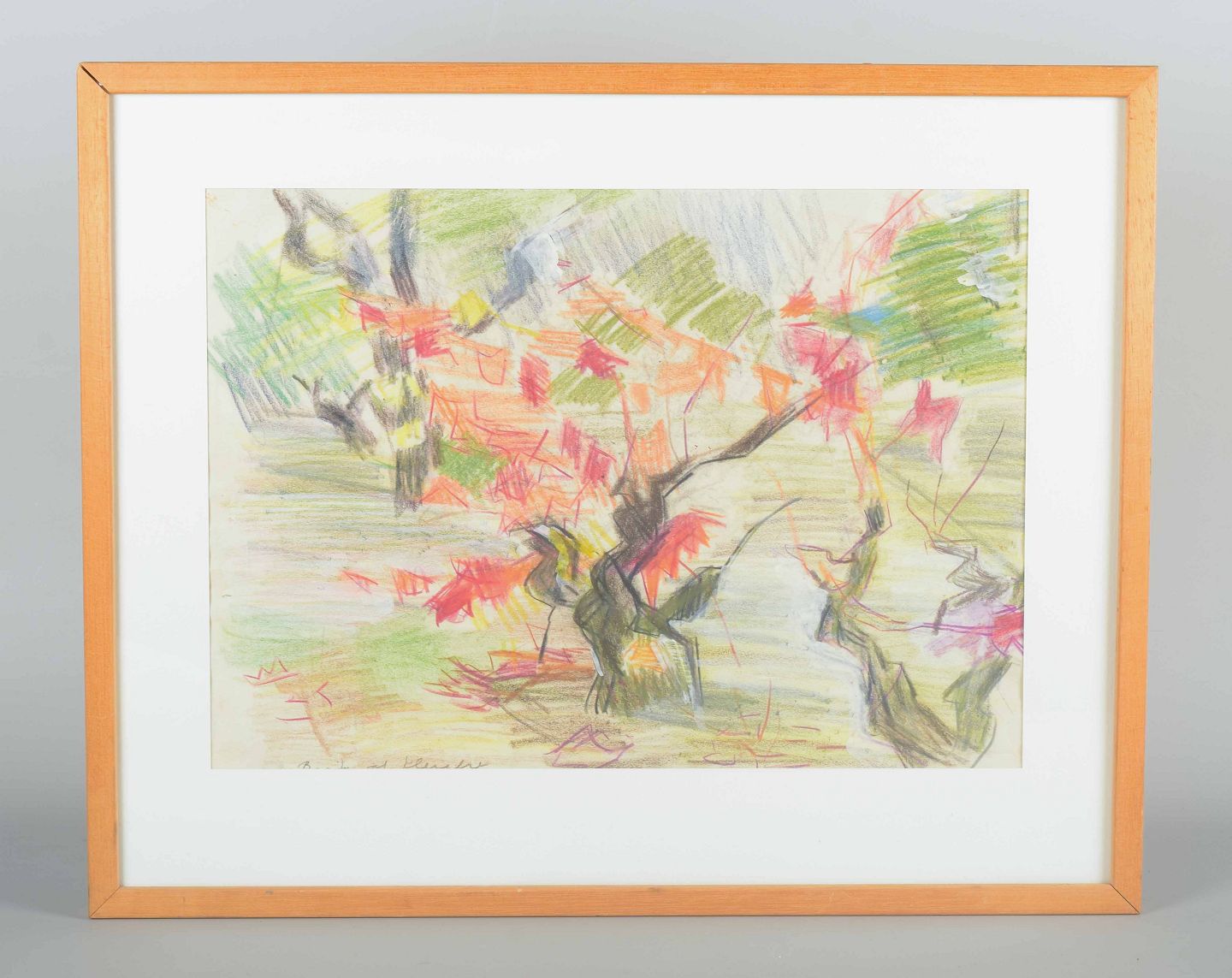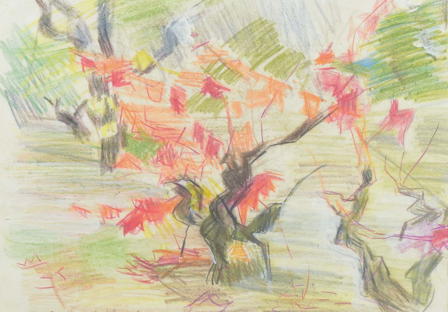 A colourful work by Swedish artist Brita af Klercker, executed in delicate yet expressive pastel strokes in green, red and yellow hues. The composition conveys a lyrical and almost musical quality, where colour fields and lines create rhythm and movement.