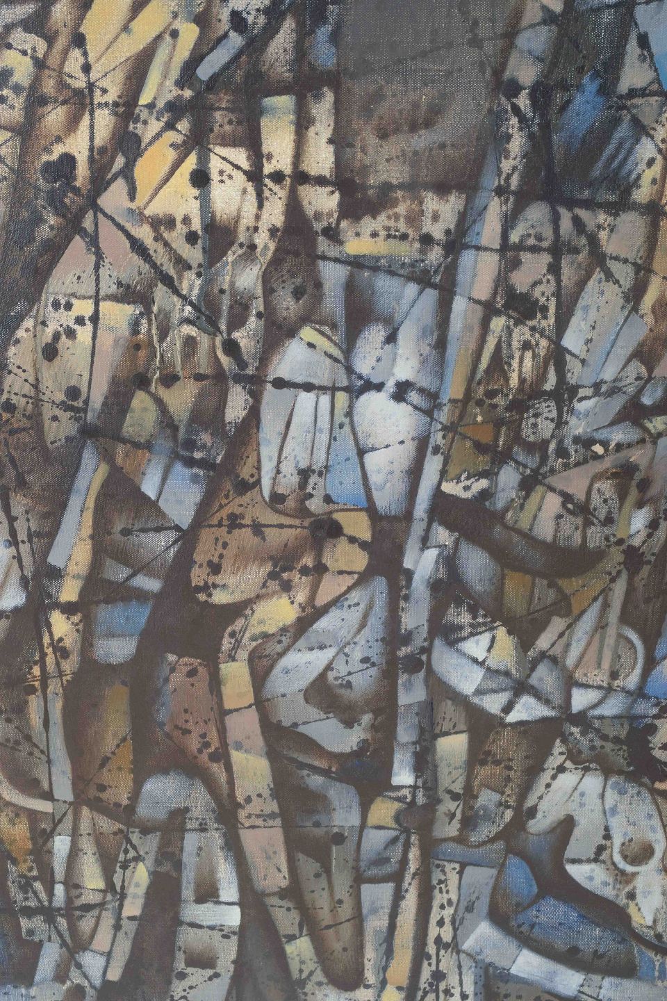 An expressive and complex abstract painting, where figurative and organic forms intertwine in a rhythmic network of lines and color fields in blue, brown, and golden tones. The work reflects Lacomblez’s characteristic surrealist-abstract language and his fascination with mythology and the dreamlike.