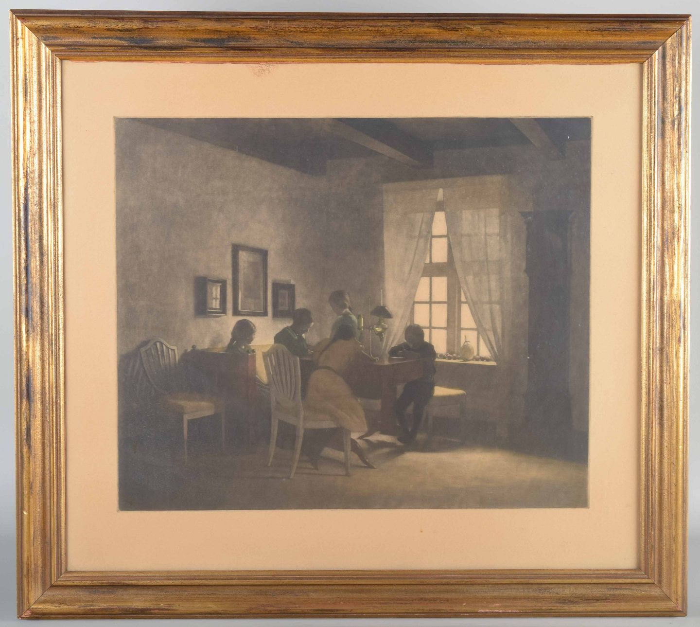 A tranquil interior scene by Peter Ilsted, depicting a group of figures gathered around a table in the soft glow of Nordic daylight. The composition highlights Ilsted’s distinctive use of calm, simplicity, and light, creating an intimate and timeless atmosphere. The work can be dated to around 1910–1925, Ilsted’s mature period, when he refined his mastery of the color mezzotint technique.