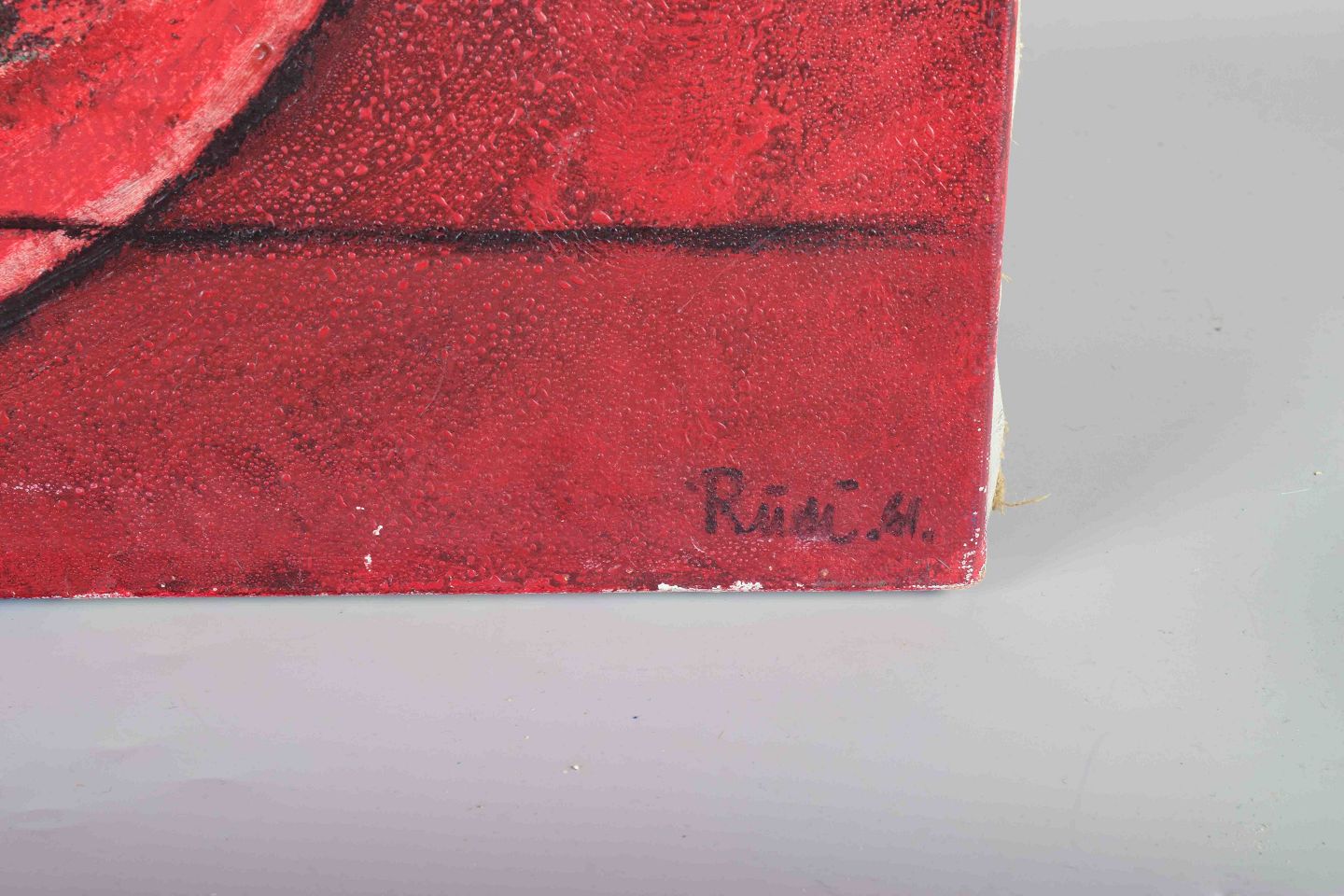 An early abstract composition by Danish painter Rudi Olsen, executed in 1961. The painting is dominated by strong red tones, geometric forms, and dynamic contrasts.