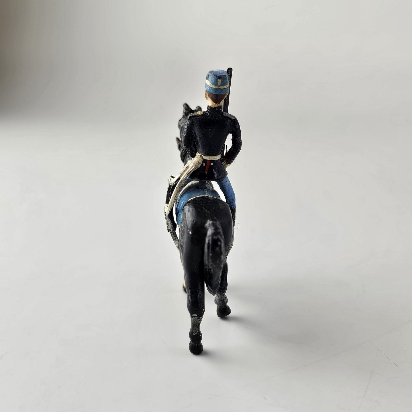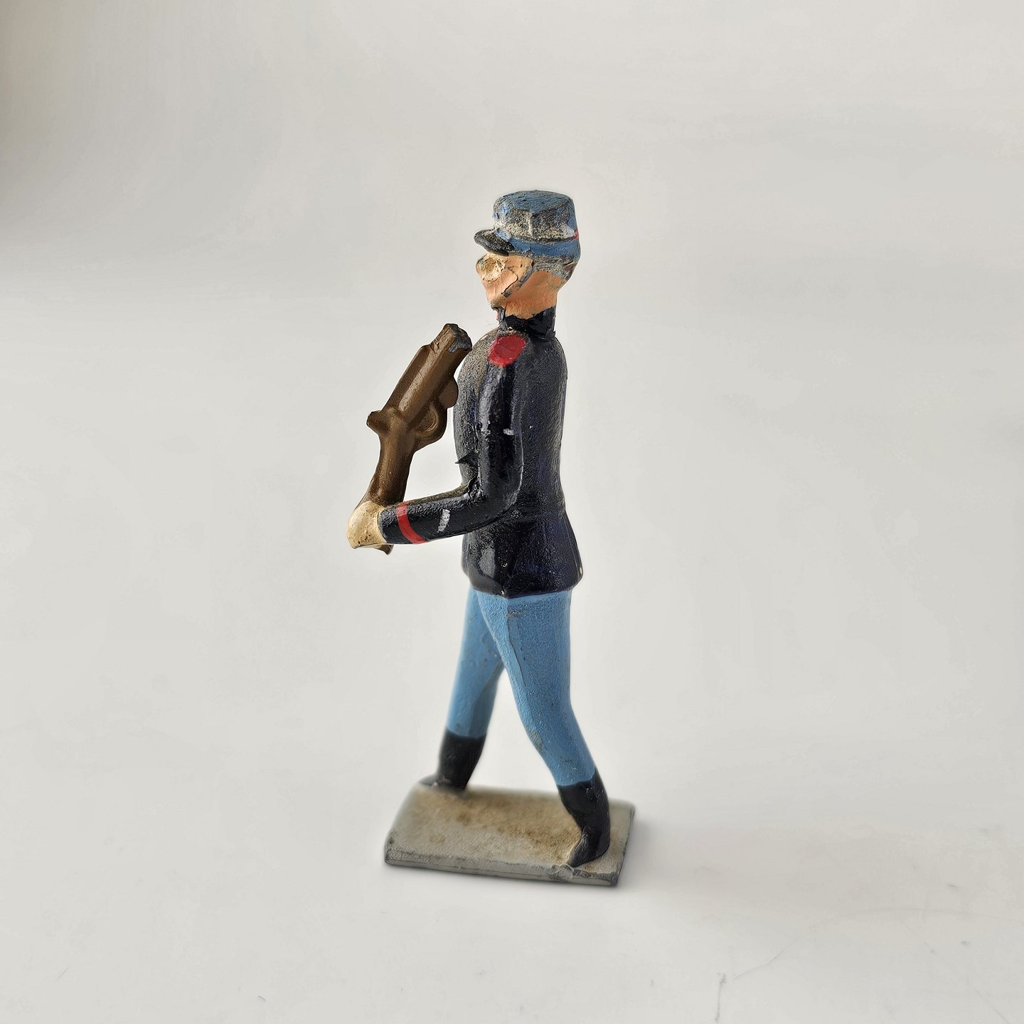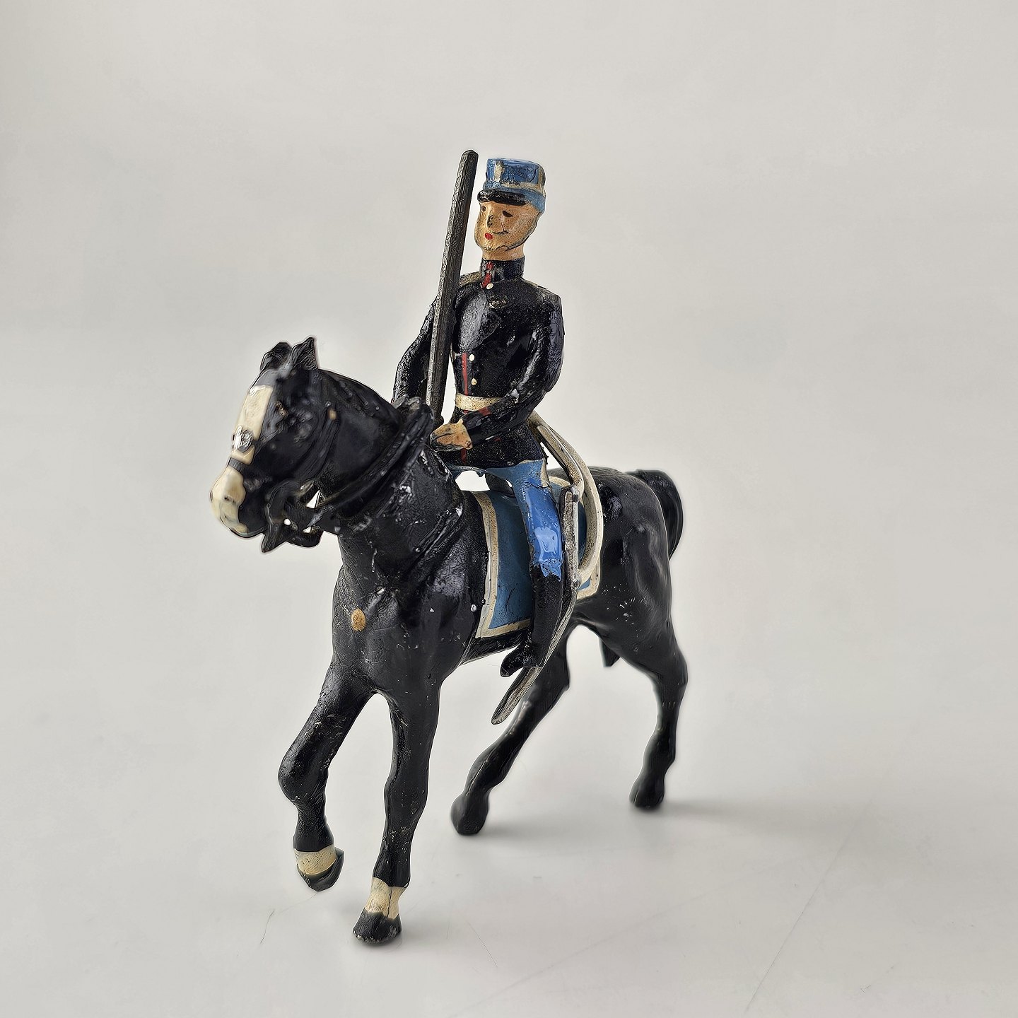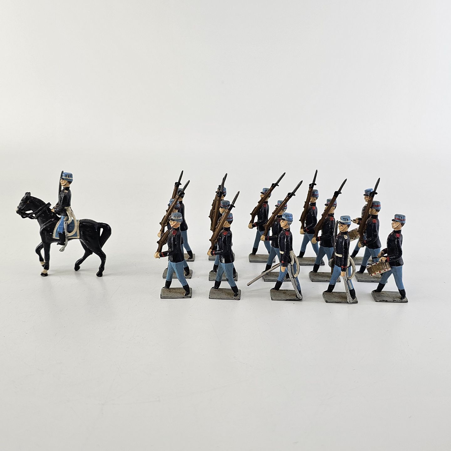 Fem figurer af soldater i tin, én til hest og 15 fodfolk med trommer eller våben