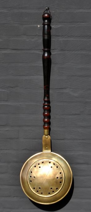Copper and brass heating basin, 19th century. Brass lid decorated with star. Brass lid is newer than the base. Wooden handle. Stamped. L: 100 cm. Dia: 29 cm.