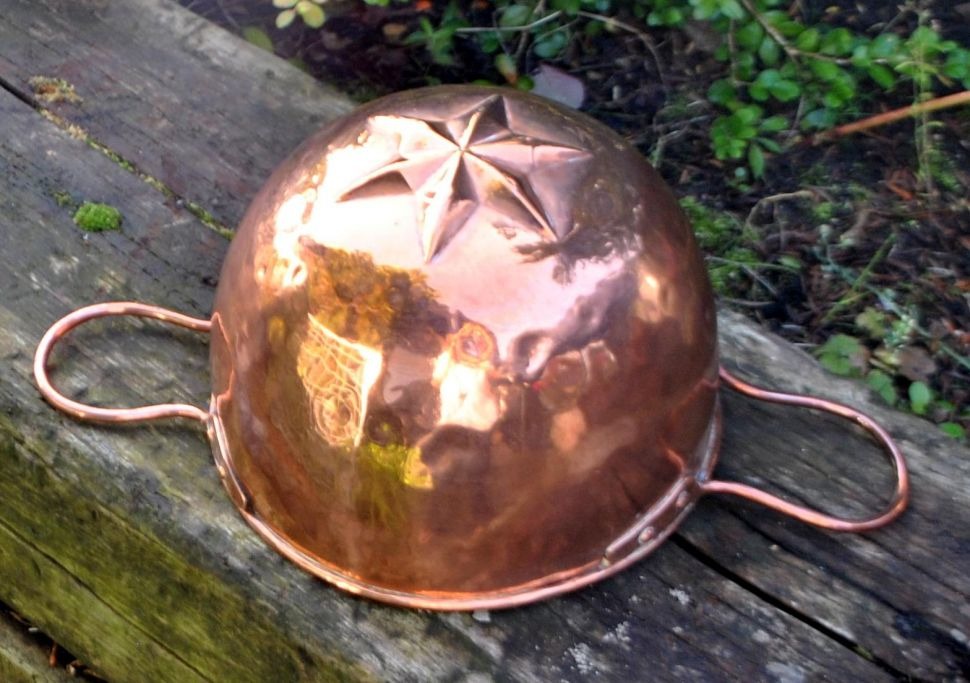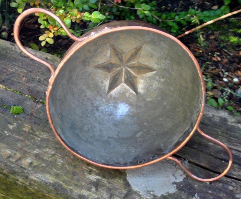 Pâté or meat dish, copper, 19th century. Denmark. With two handles and decoration in the shape of a star. Dia: 21.5 cm. Dia. incl. handle: 37.5 cm. H: 14 cm. No visible stamps.