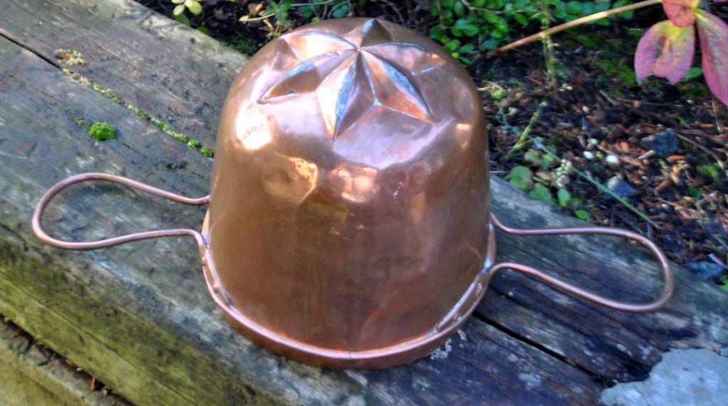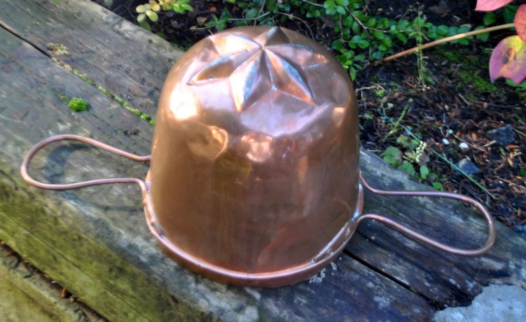 Pâté or meat dish, copper, 19th century. Denmark. With two handles and decoration in the shape of a star. Dia: 21.5 cm. Dia. incl. handle: 46 cm. H: 19 cm. No visible stamps.