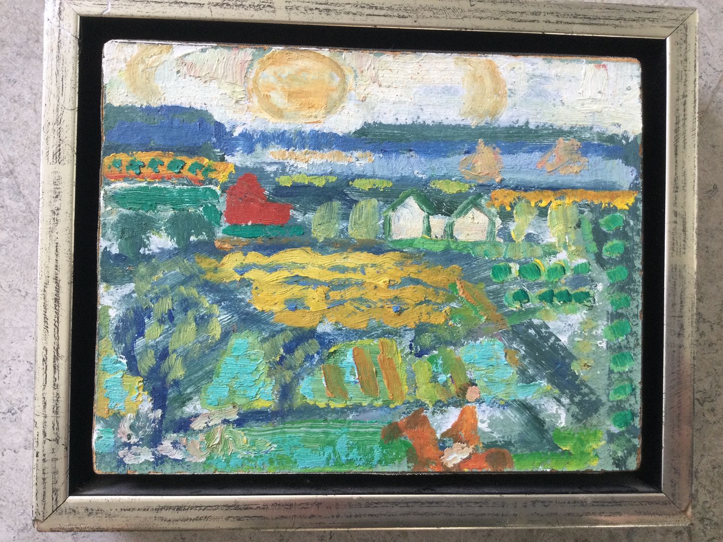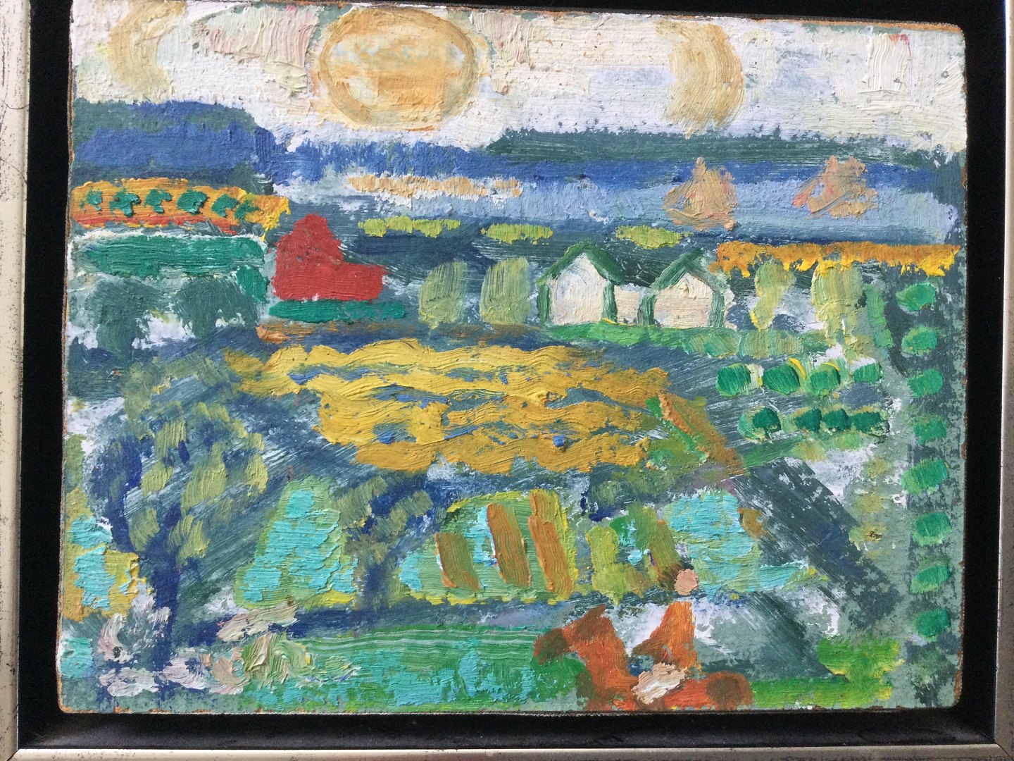 Maleri af Leo Thellefsen - landskab med huse og kvinde til hest.