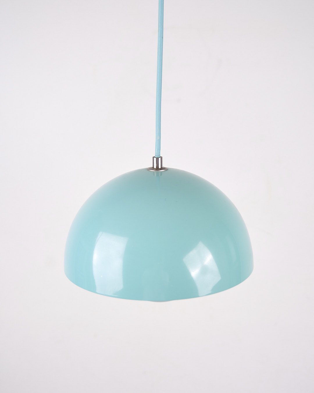 Flowerpot pendant lamp, model VP1, designed by Verner Panton in 1968 and produced by &Tradition. The lamp is made of baby blue lacquered metal with the iconic double shade design.