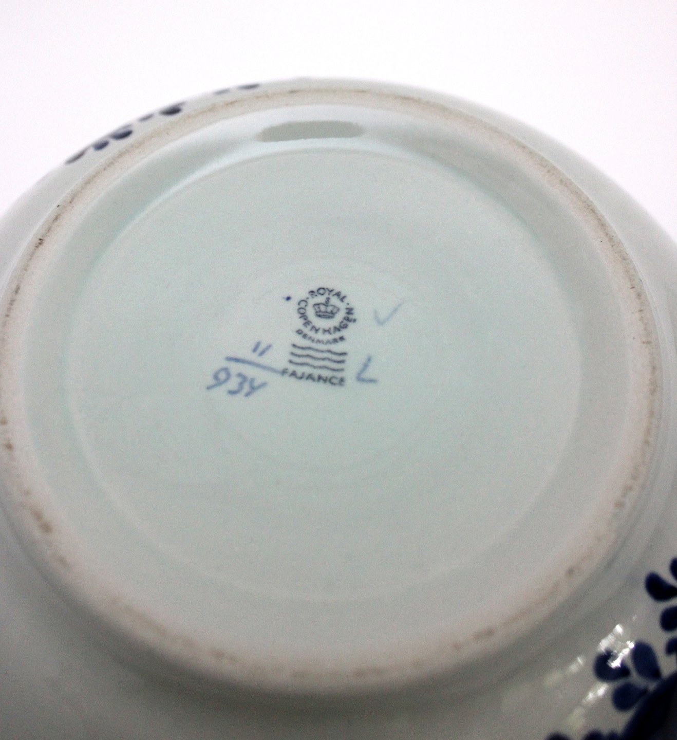 Text available in Danish: Royal Copenhagen, Tranquebar lyseblå fajance med mørkeblå tulipan og flettet bort designet af Christian Joachim. Håndmalet.
