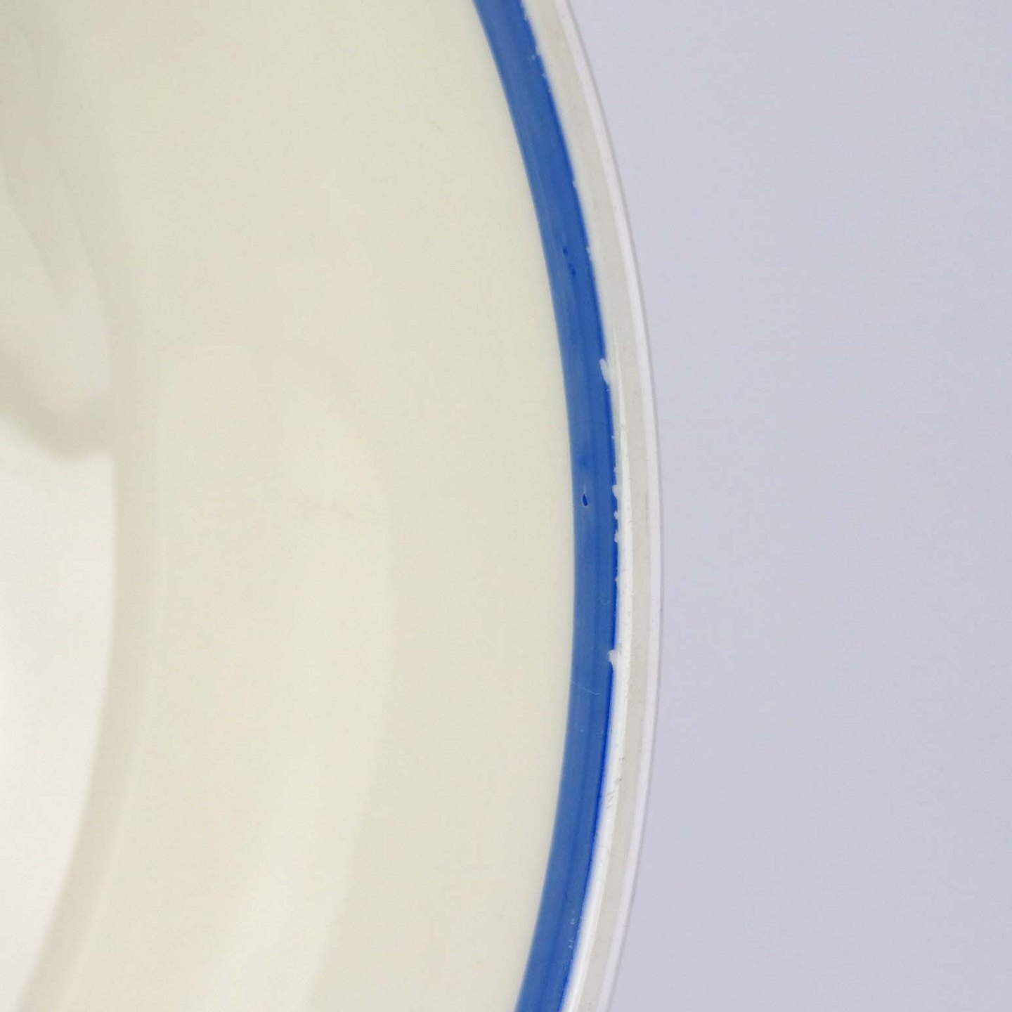 Service i glat lyst porcelæn med blå kantstreg og dekoration med horn samt blå og røde blomster.