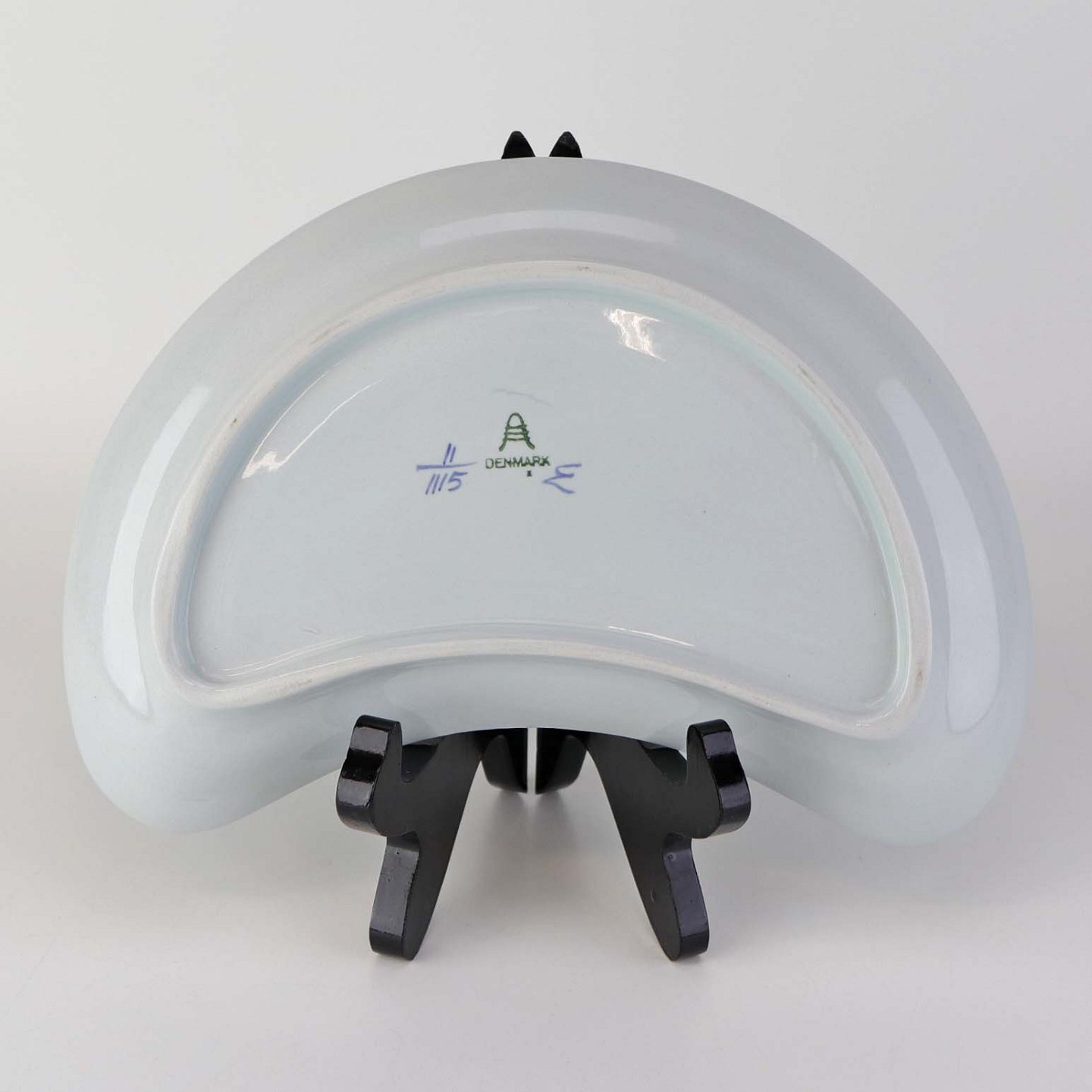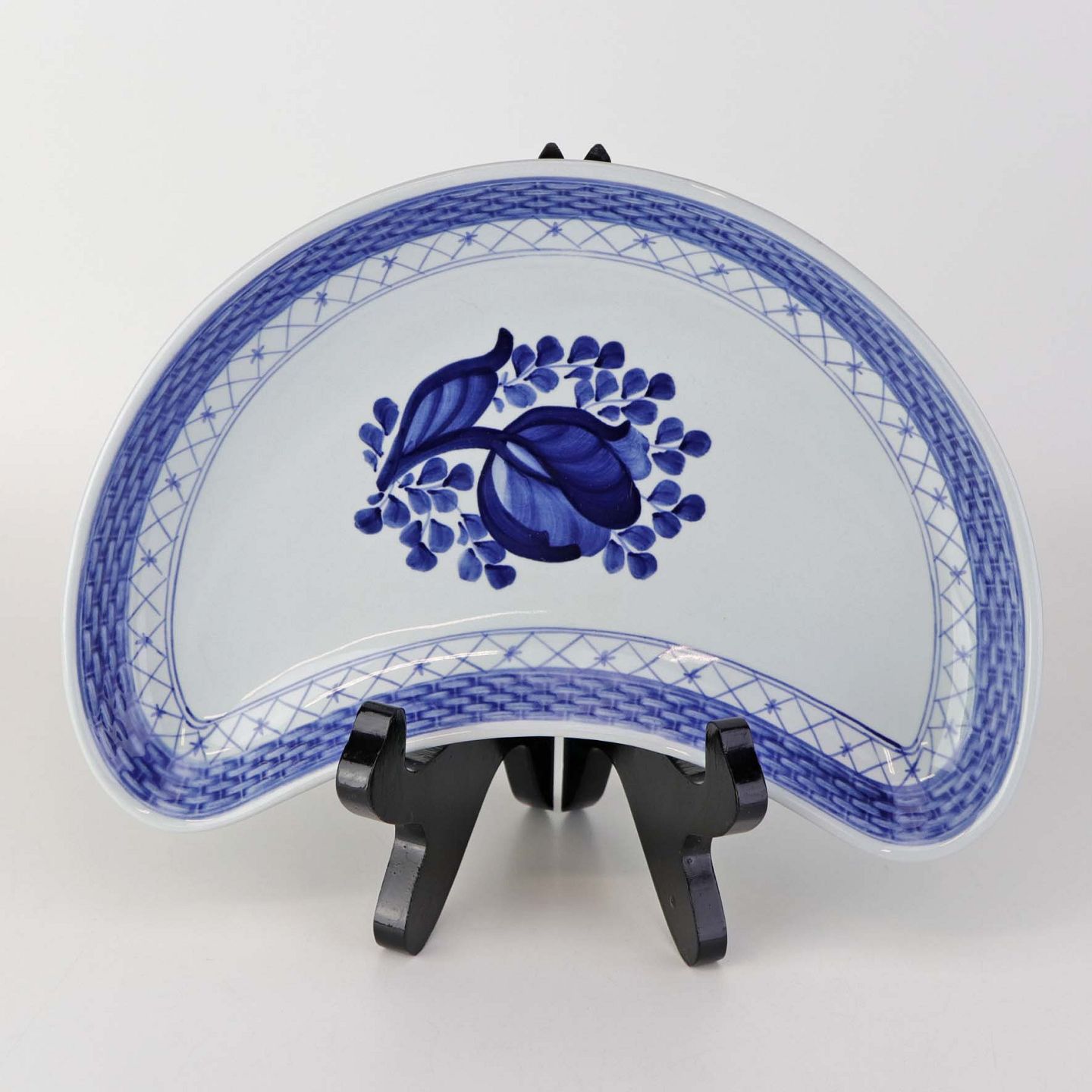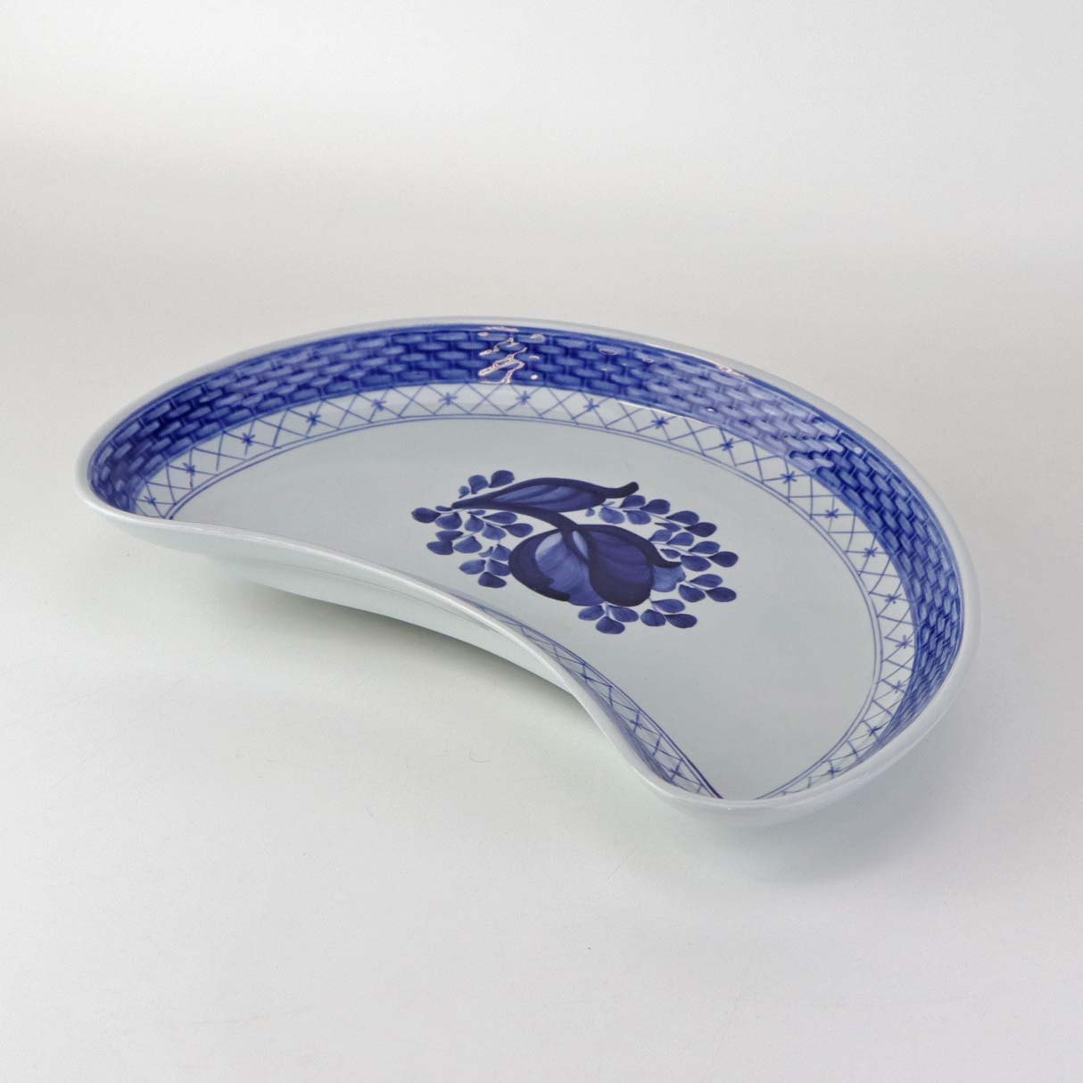 Halvmåneformet kagefad i fajance fra stellet Blå Tranquebar. Nr. 11/1115