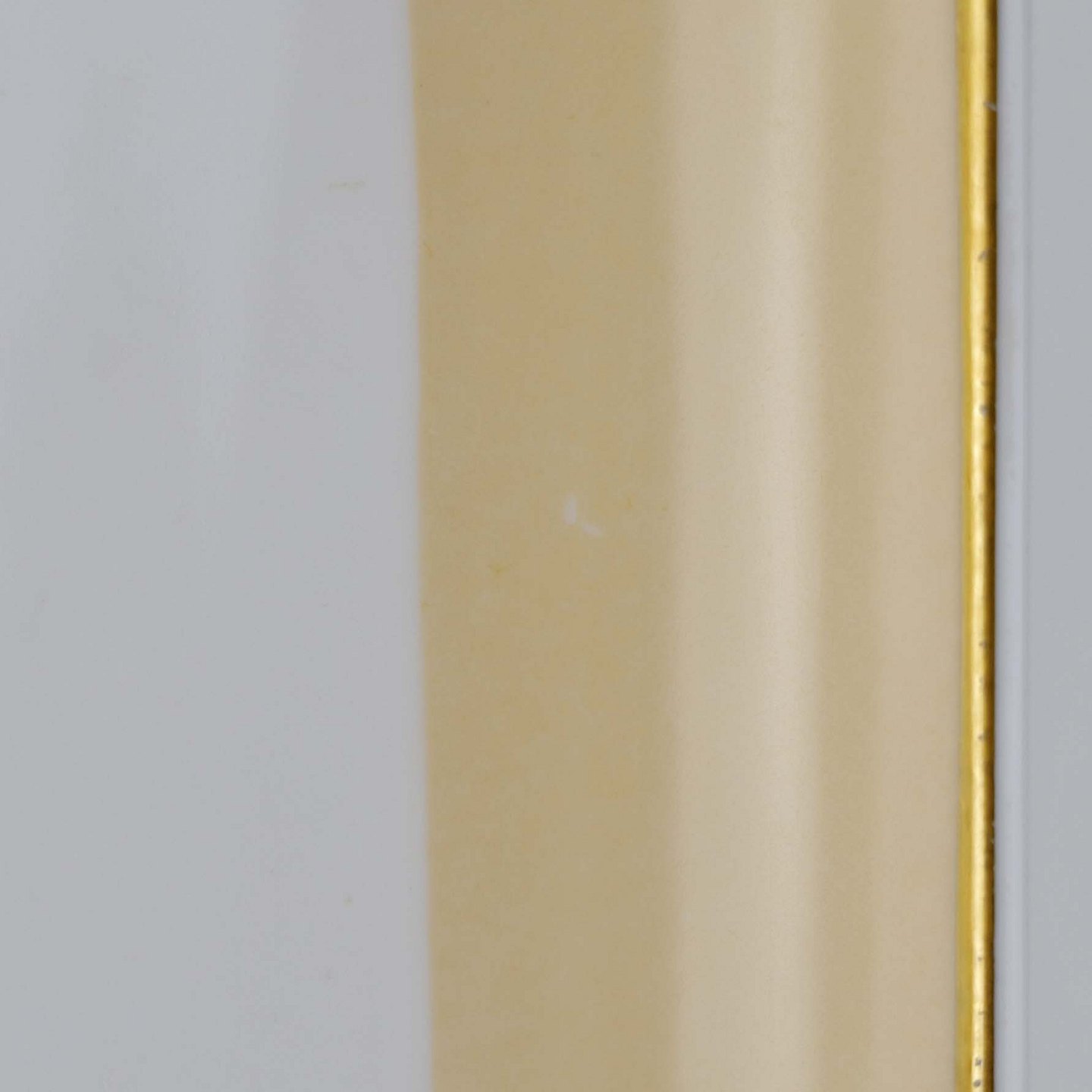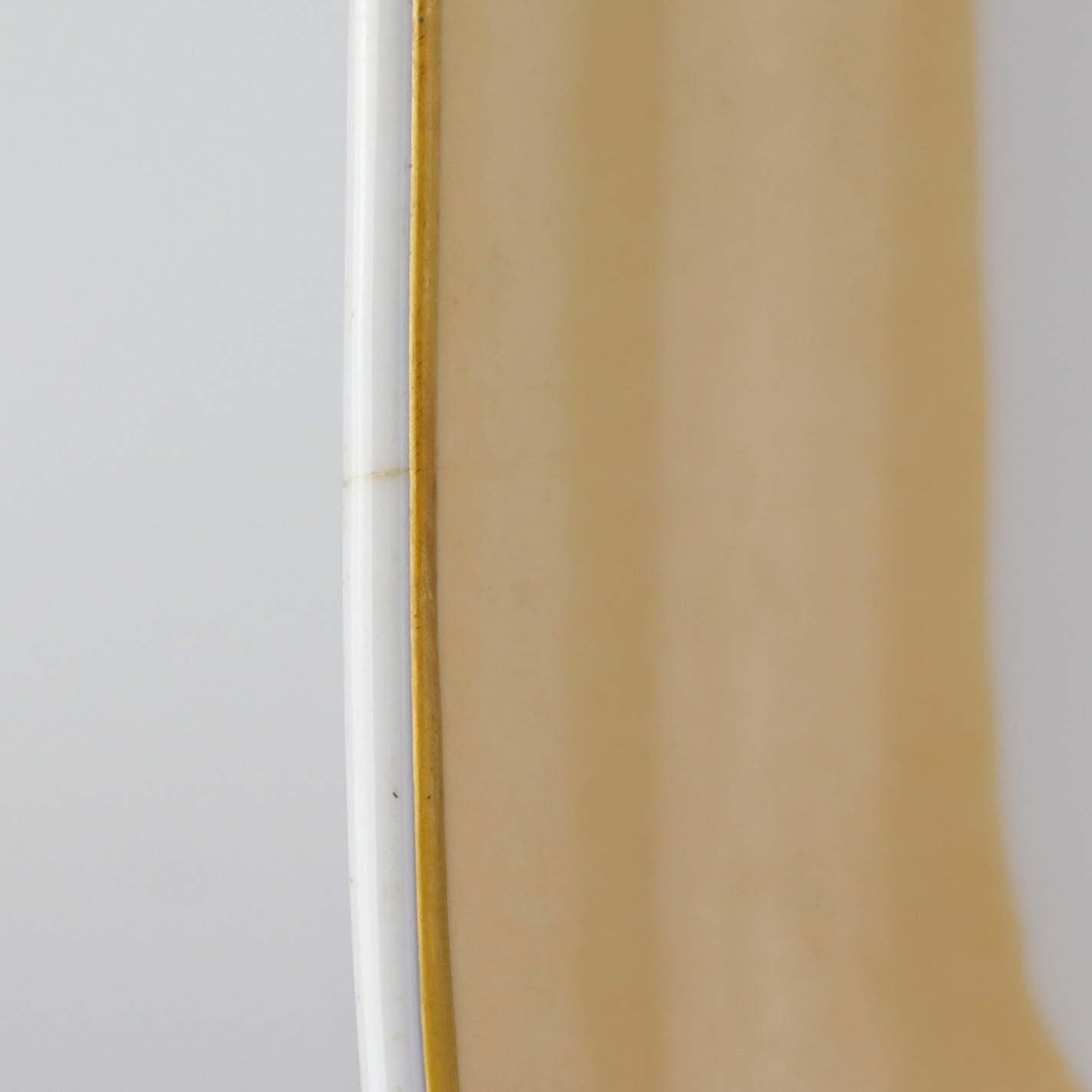 Service i glat hvid porcelæn med sandfarvet dekoration og gylden kant.