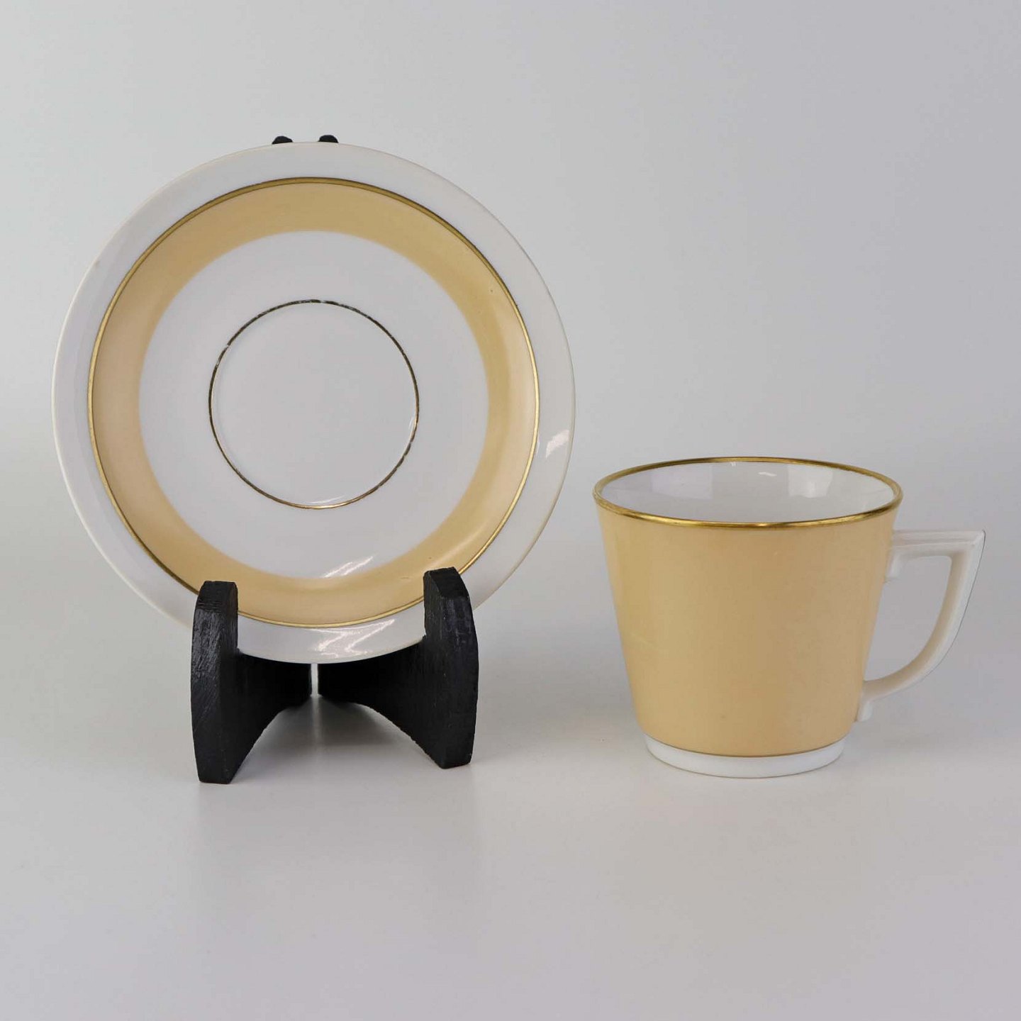 Service i glat hvid porcelæn med sandfarvet dekoration og gylden kant.